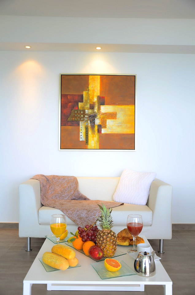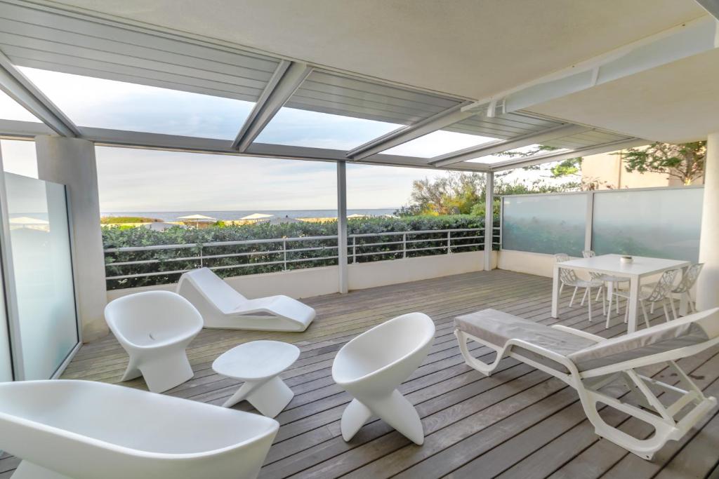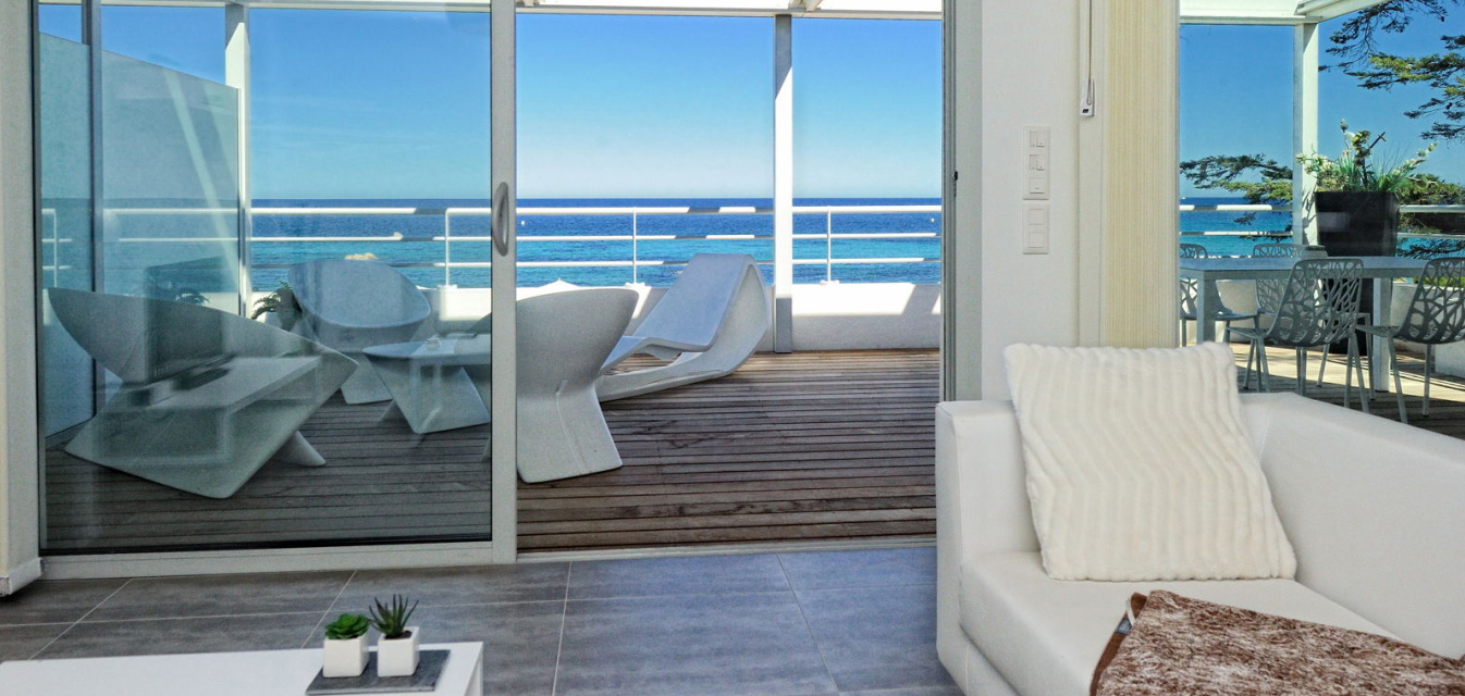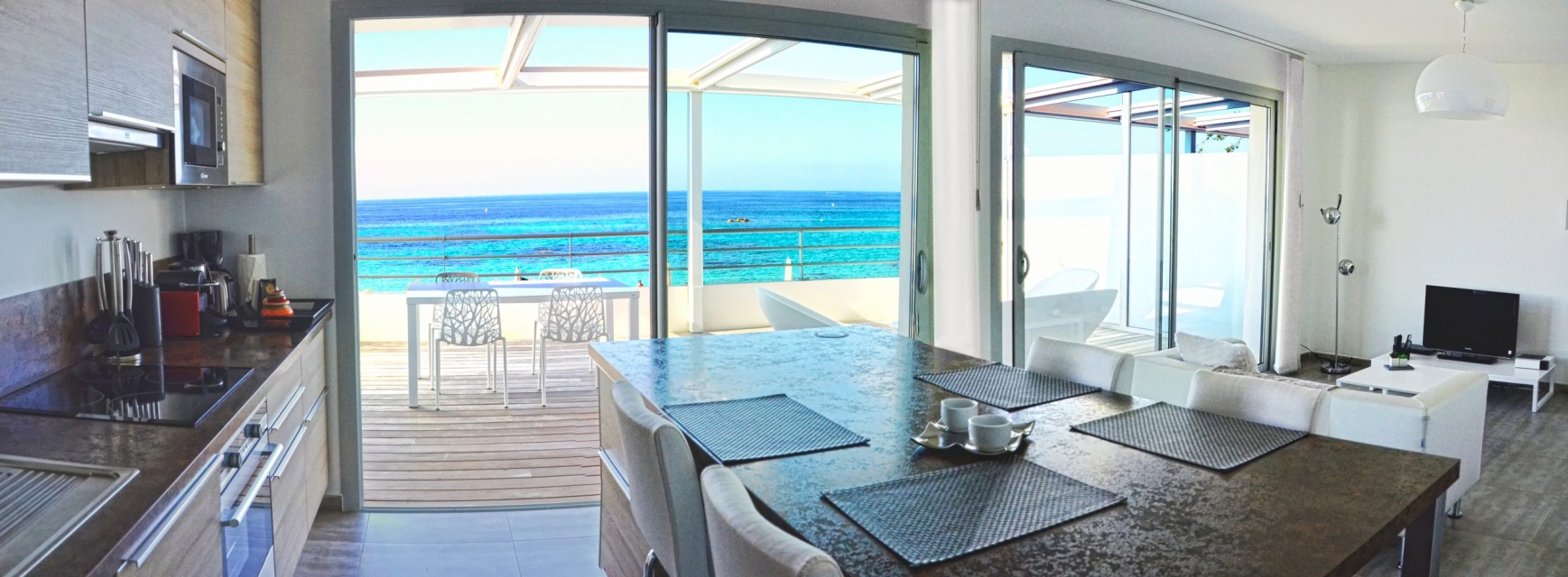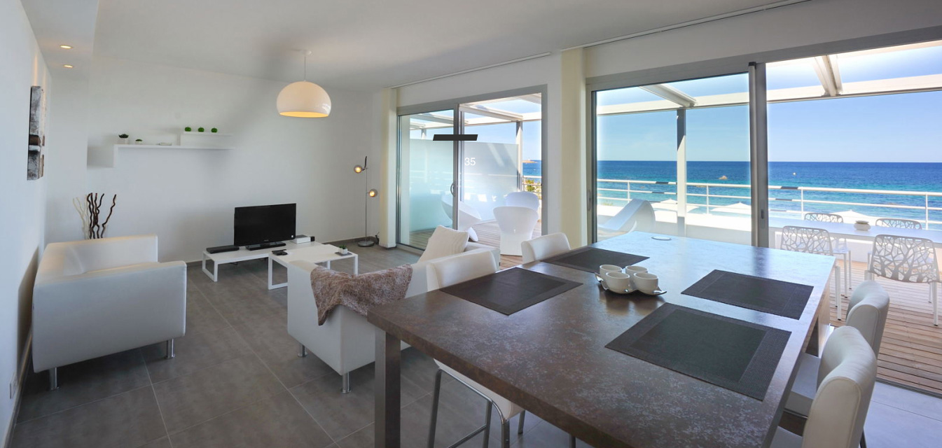 - Apartmán – pre max 4 osoby má spálňu s manželskou posteľou, LCD flat TV, trezor, vlastnú kúpeľňu so sprchovacím kútom, vaňou a WC, 1 spálňa s 2 samostatnými lôžkami, LCD flat TV, kúpeľňa so sprchovacím kútom a WC, obývacia izba s výhľadom na more a s LCD flat TV prepojená s plne vybavenou kuchyňou - indukčná varná doska, chladnička, mraznička, rúra, mikrovlnná rúra, umývačka riadu, Nespresso kávovar, rýchlovarná kanvica, tlakový hrniec, mixér, klimatizácia/ kúrenie, wifi. K dispozícii vysávač, žehlička, žehliaca doska, práčka so sušičkou, sušič na vlasy. Terasa s jedálenským stolom a posedením.