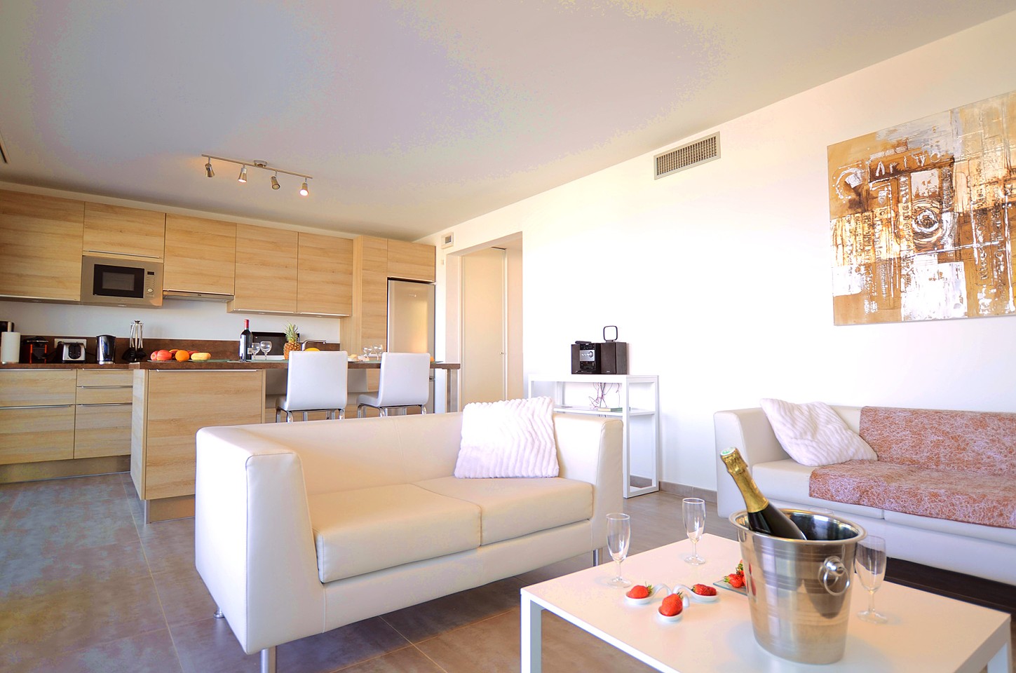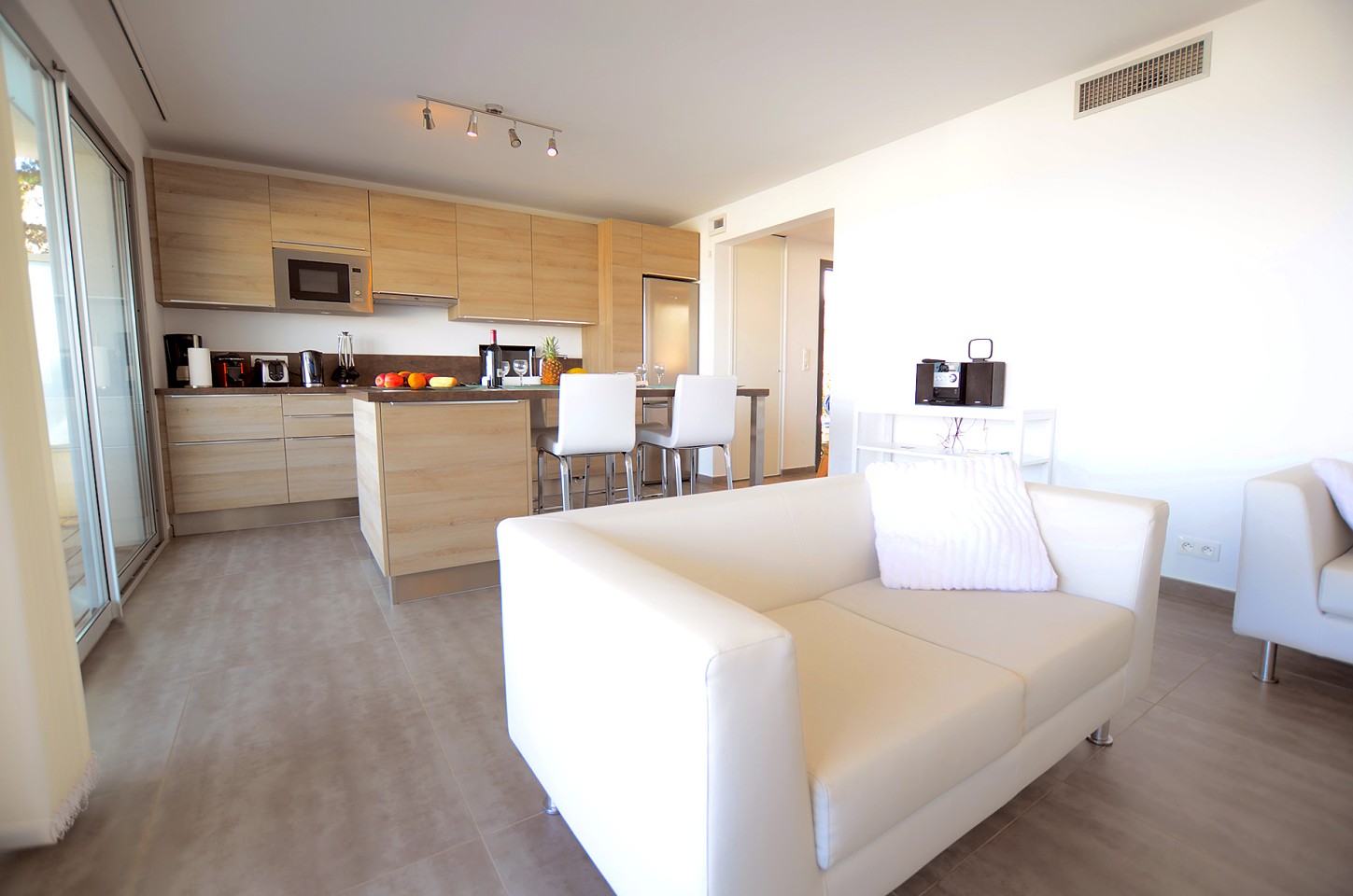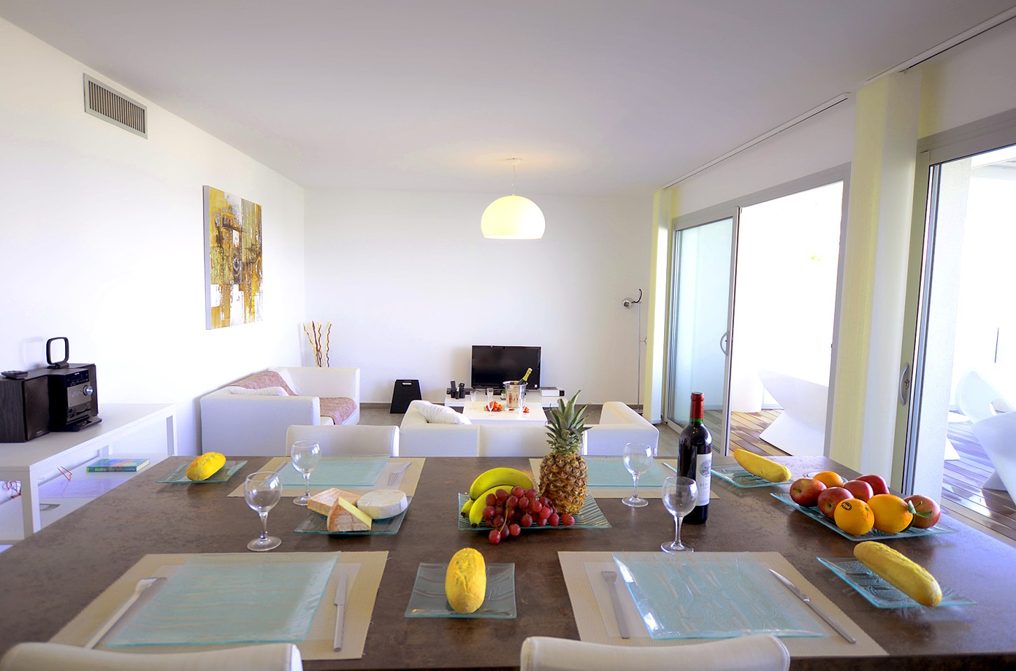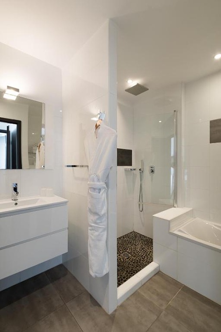 - Apartmán – pre max 4 osoby má spálňu s manželskou posteľou, LCD flat TV, trezor, vlastnú kúpeľňu so sprchovacím kútom, vaňou a WC, 1 spálňa s 2 samostatnými lôžkami, LCD flat TV, kúpeľňa so sprchovacím kútom a WC, obývacia izba s výhľadom na more a s LCD flat TV prepojená s plne vybavenou kuchyňou - indukčná varná doska, chladnička, mraznička, rúra, mikrovlnná rúra, umývačka riadu, Nespresso kávovar, rýchlovarná kanvica, tlakový hrniec, mixér, klimatizácia/ kúrenie, wifi. K dispozícii vysávač, žehlička, žehliaca doska, práčka so sušičkou, sušič na vlasy. Terasa s jedálenským stolom a posedením.