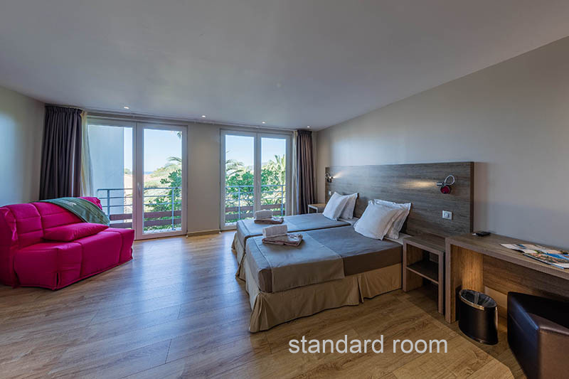 332 izieb 1-3 lôžkových v menších budovách, majú kúpeľňu so sprchovacím kútom, WC, niektoré sušič vlasov, SAT TV s plochou obrazovkou, telefón, trezor zadarmo, spálňa s manželskou posteľou alebo 2 samostatnými lôžkami, balkón alebo terasa, za príplatok izba s výhľadom do záhrady alebo na more.