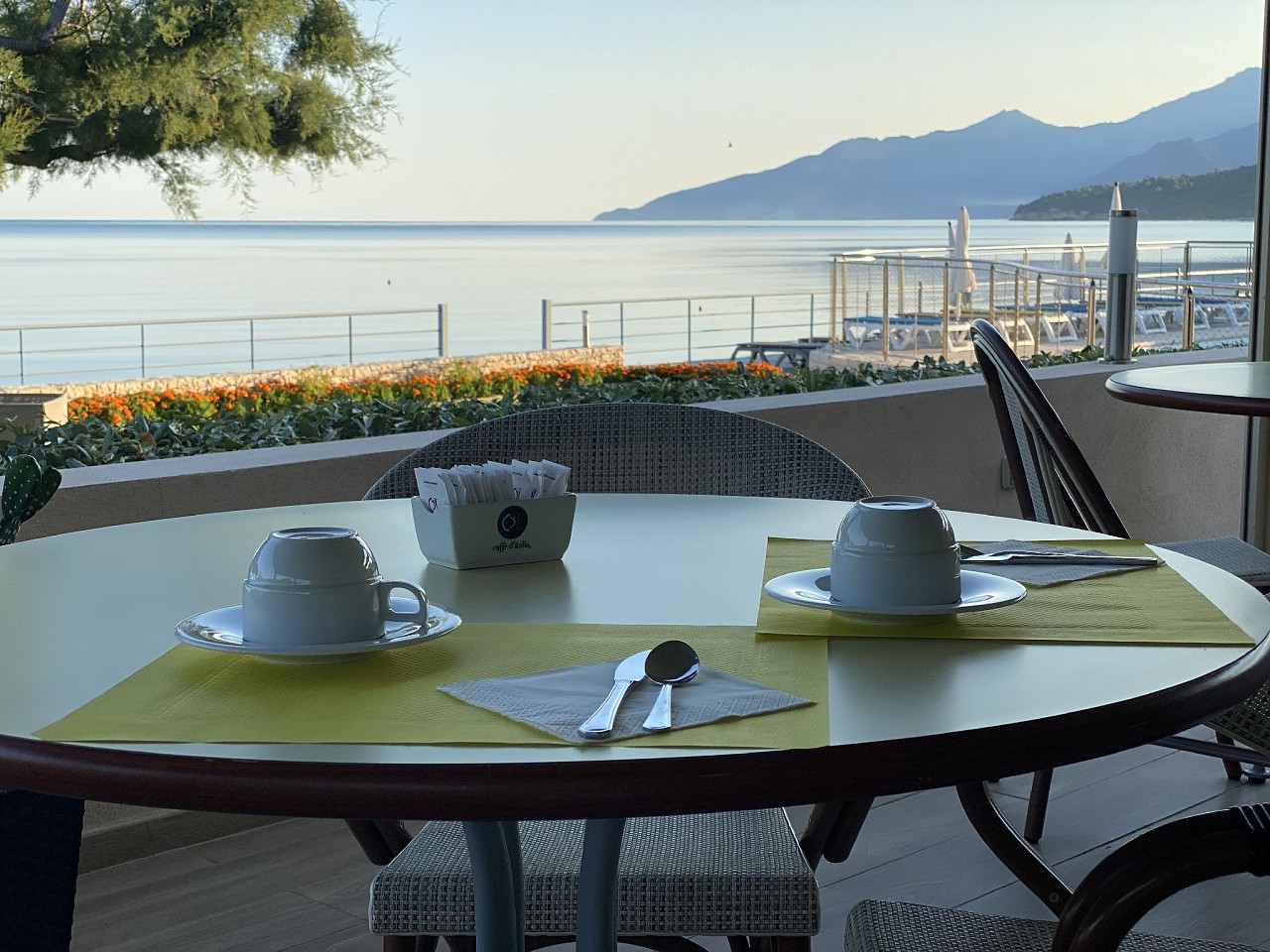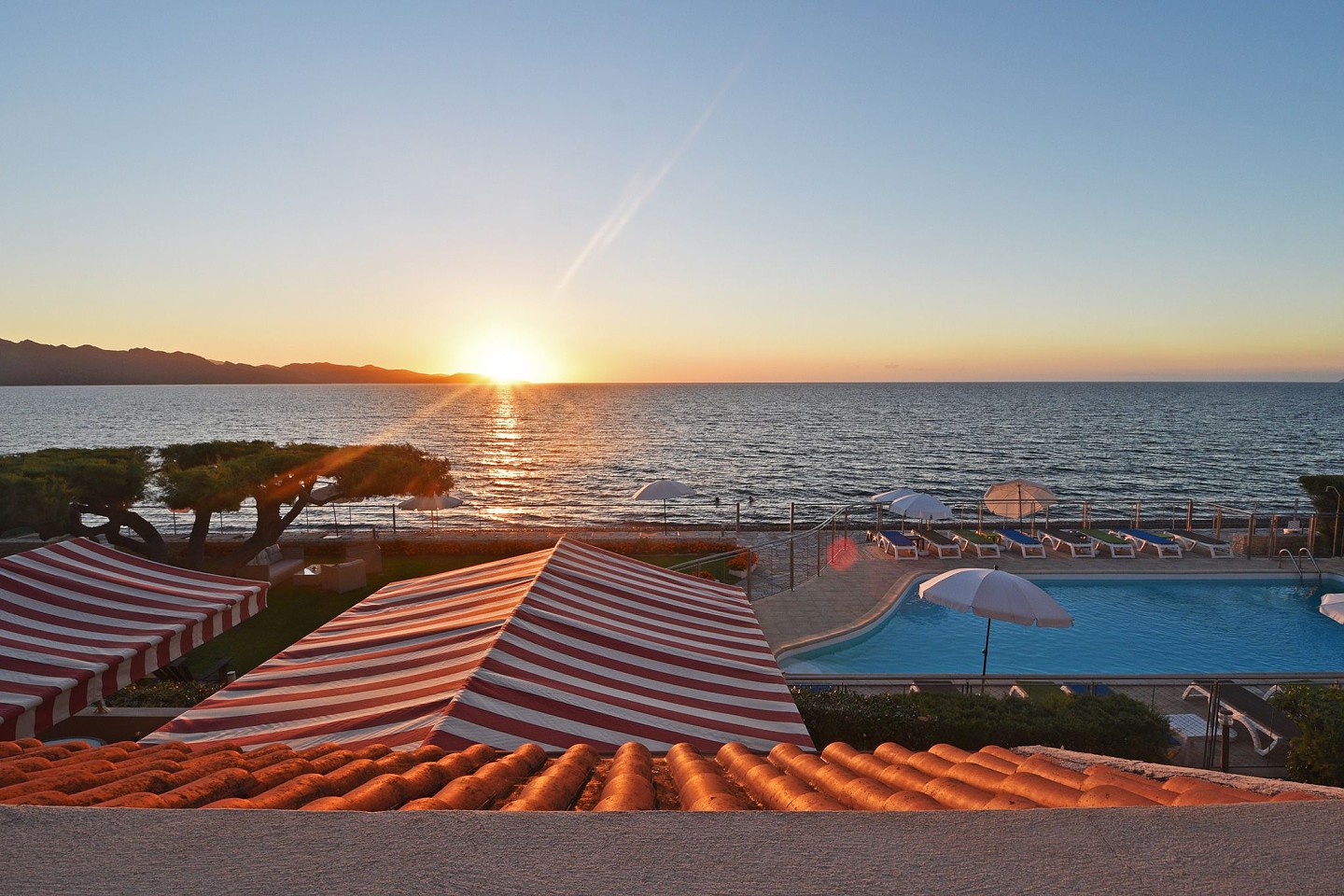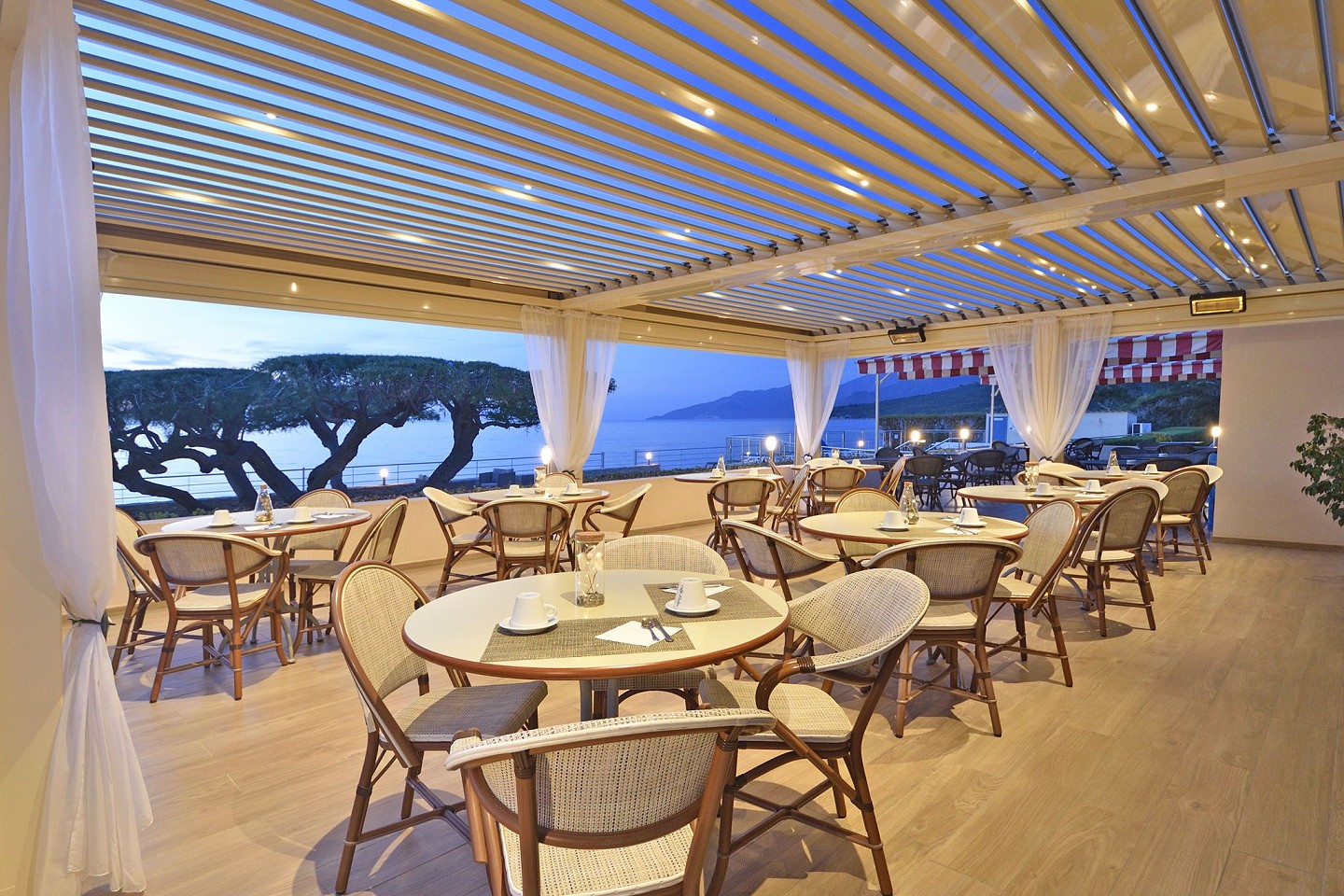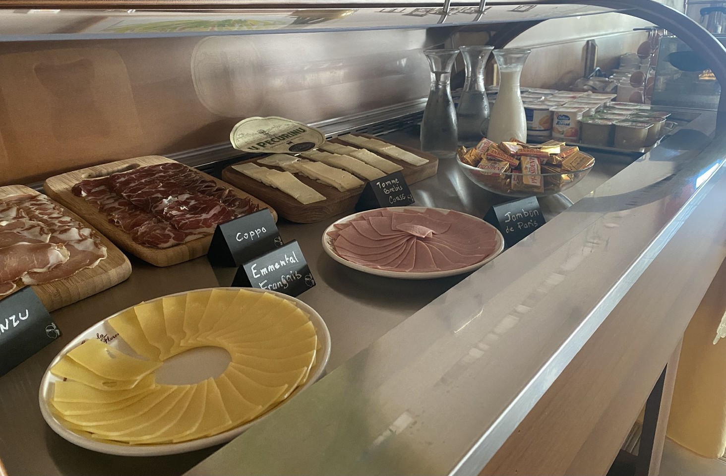Raňajky - kontinentálne a zameriavajú sa na čerstvé lokálne produkty, vrátane typického korzického pečiva, džemov a ovocia a sú podávané v svetlej raňajkovej miestnosti s výhľadom na more alebo na vonkajšej terase v hotelovej záhrade.