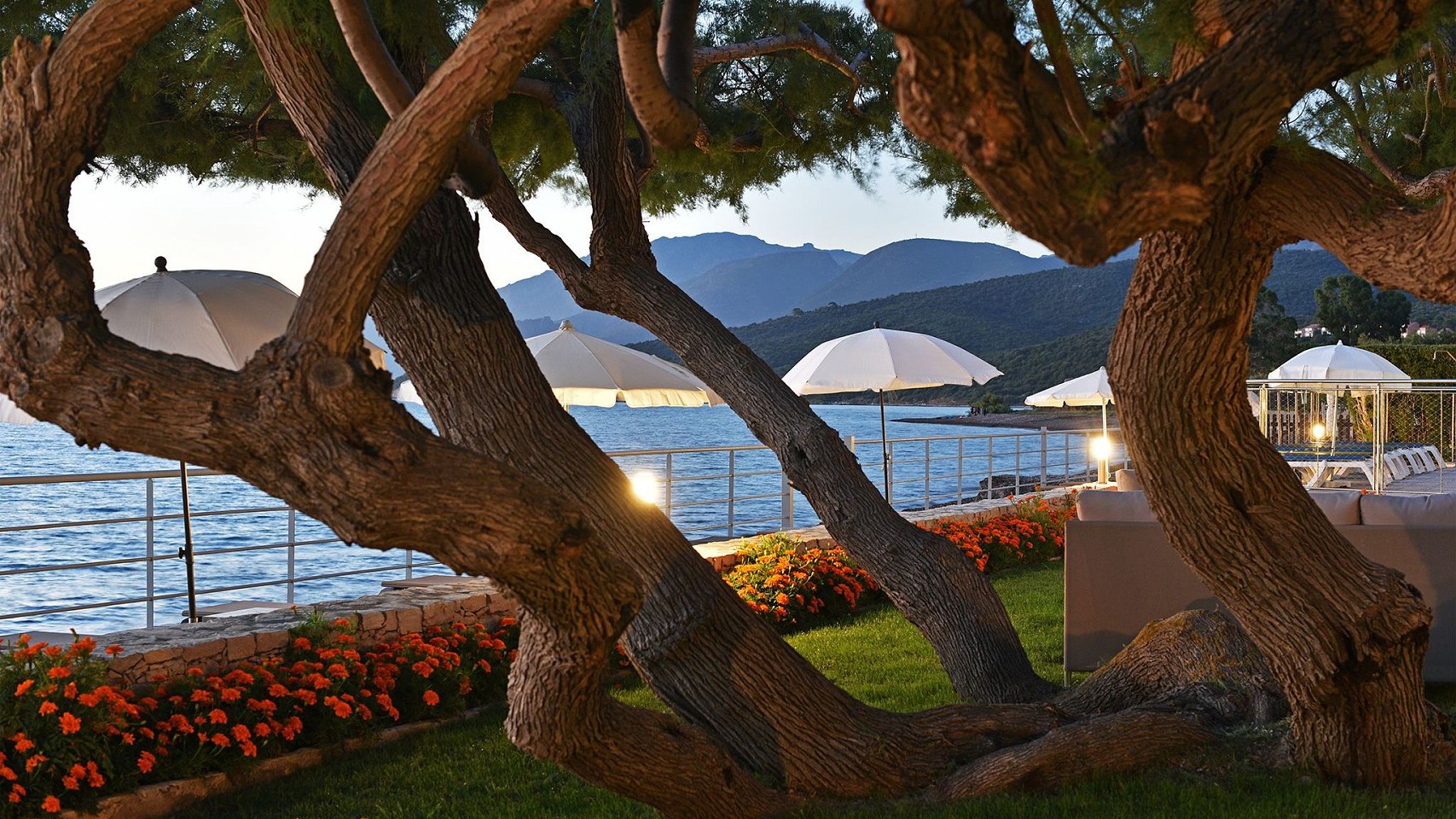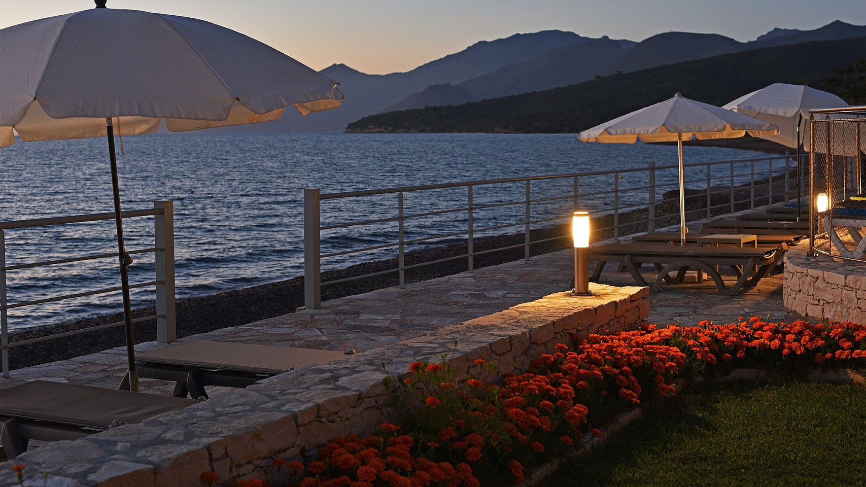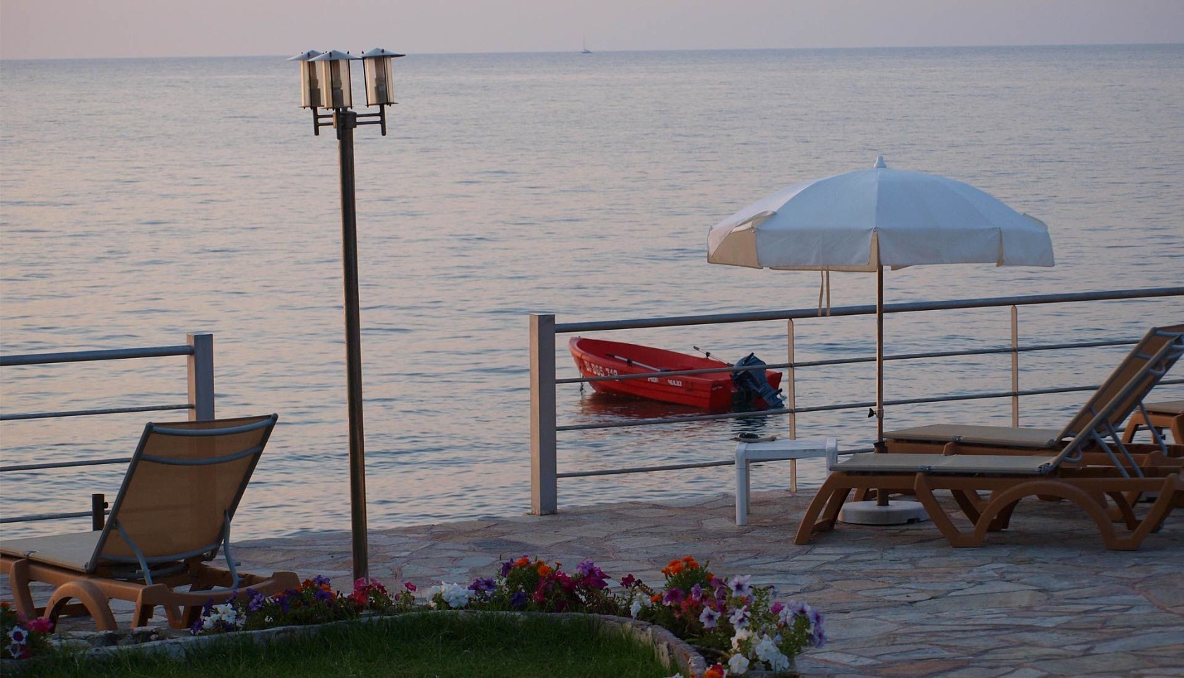 Pláž s hrubým pieskom a kamienkami je vzdialená len pár krokov od hotela, keďže sa nachádza priamo za hotelovou záhradou v prvej línii pri mori.