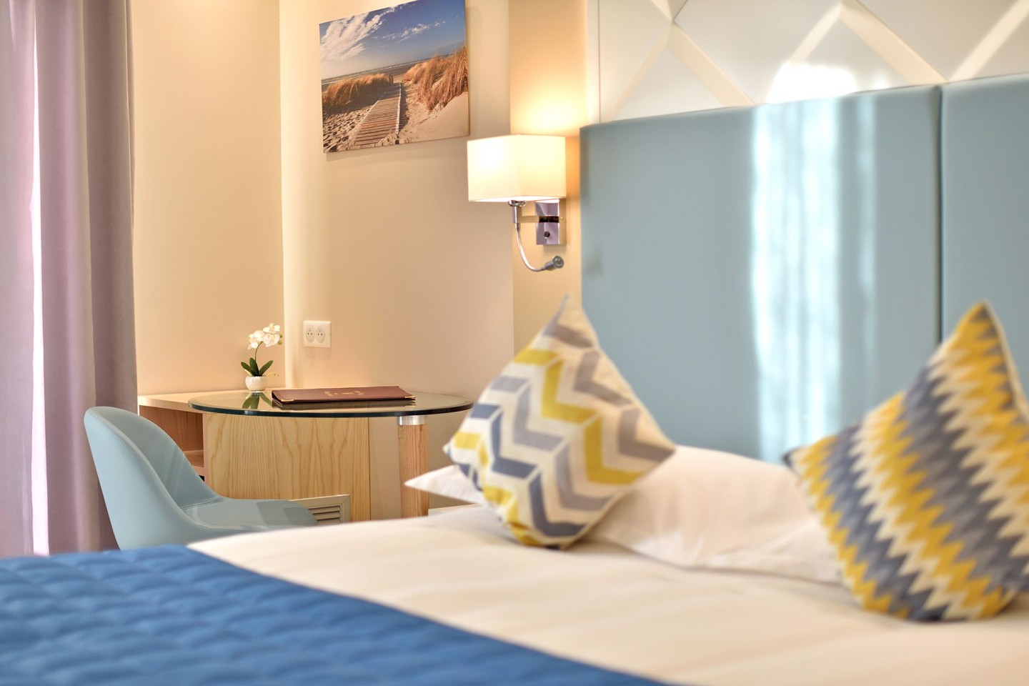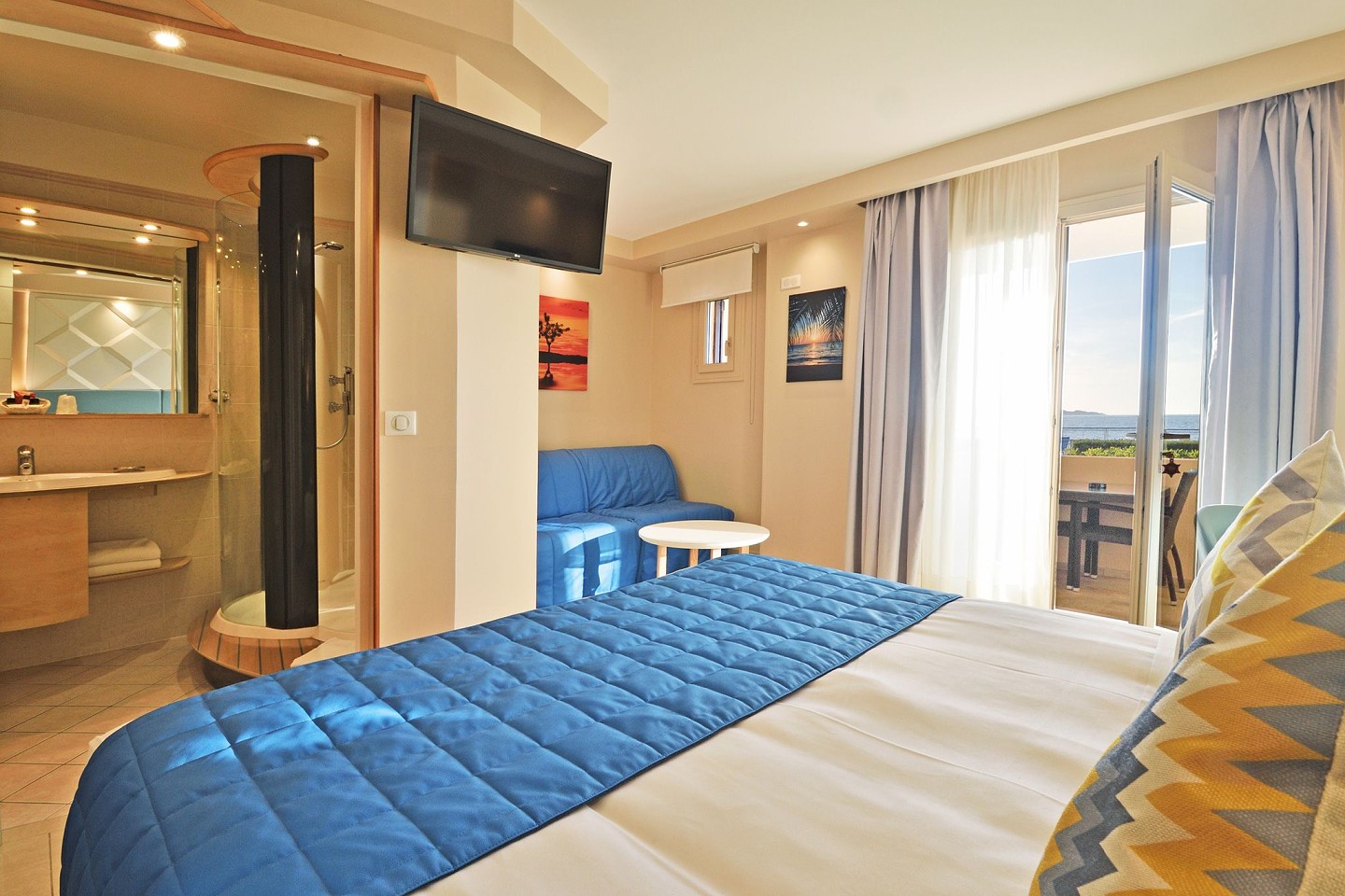 - Superior/ výhľad more – cca 25m2, pre max 2 osoby má manželskú posteľ alebo 2 samostatné lôžka, podľa preferencií, kúpeľňu s WC a terasu s výhľadom na more.