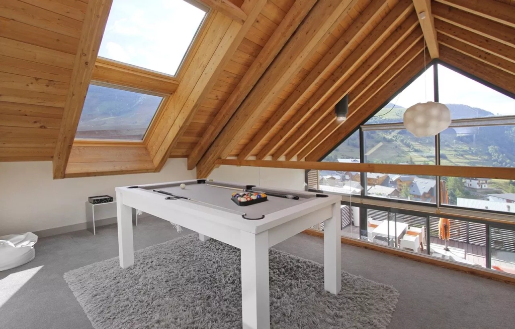 - 2. poschodie – mezzanine s francúzskym lôžkom a biliardovým stolom, 2 spálne s manželskou posteľou, kúpeľňa a WC. Terasa s nýbytkom a vírivkou.