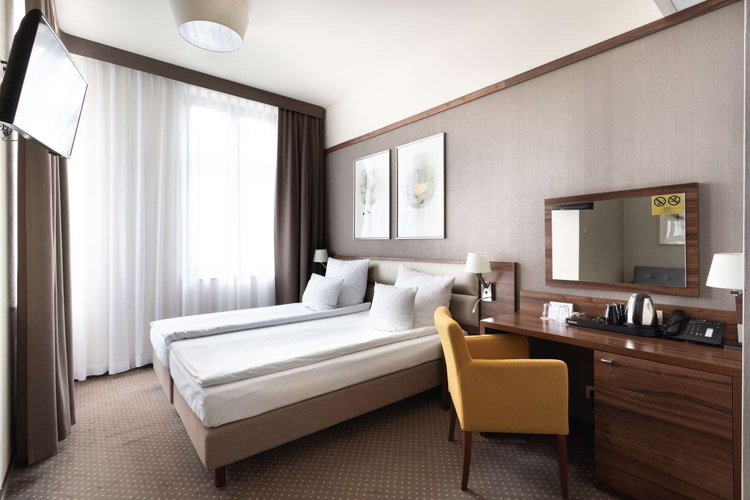 - Jednolôžková izba – 14 m2 pre 1 osobu má 1 lôžko, písací stôl, kútik s posedením, kúpeľňu so sprchou a WC.