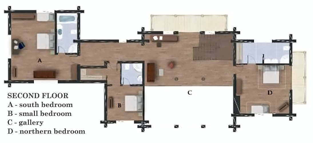 - 2. poschodie: 2 spálne každá s manželskou posteľou a samostatným lôžkom a kúpeľňou,