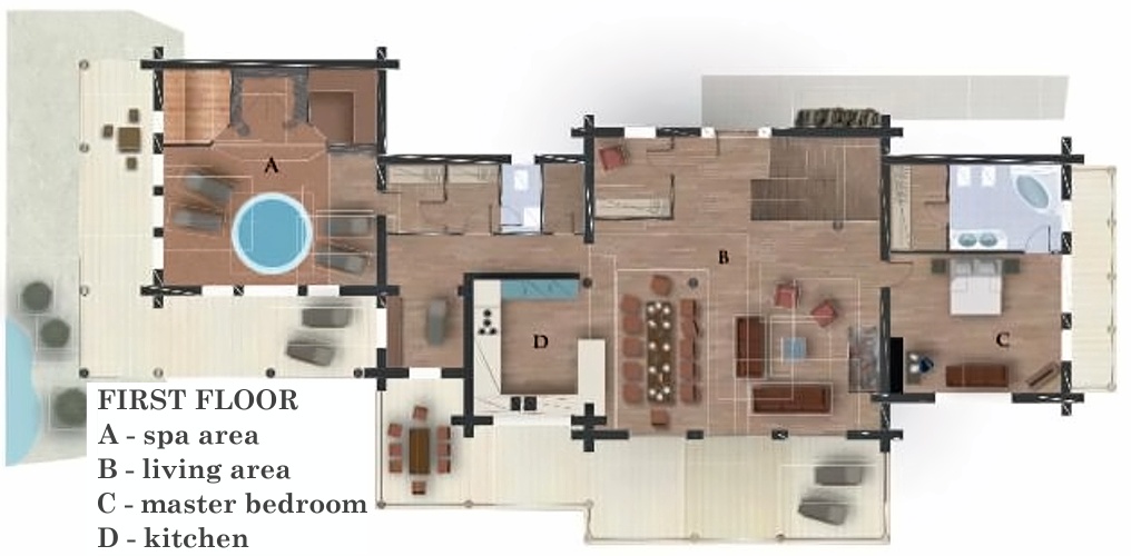 kuchyňa, veľká obývacia miestnosť s krbom, wellness zóna, terasa.