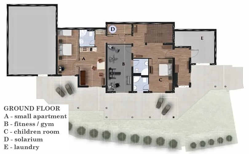 s kuchynským kútikom a gaučom, kúpeľňa so sprchou a WC. Izba s 2 lôžkami a kúpeľňou, fitness miestnosť, práčovňa a terasa.