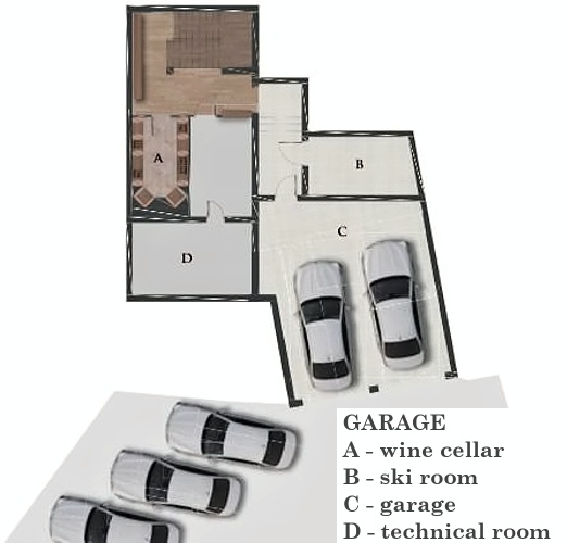 - Pivnica: vínna pivnica, lyžiareň, garáž pre 2 autá a technická miestnosť.