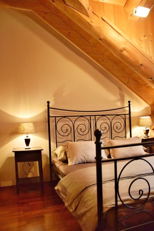 malá spálňa s manželskou posteľou a kúpeľňou, obývacia časť / otvorená galéria nad obývacou zónou.