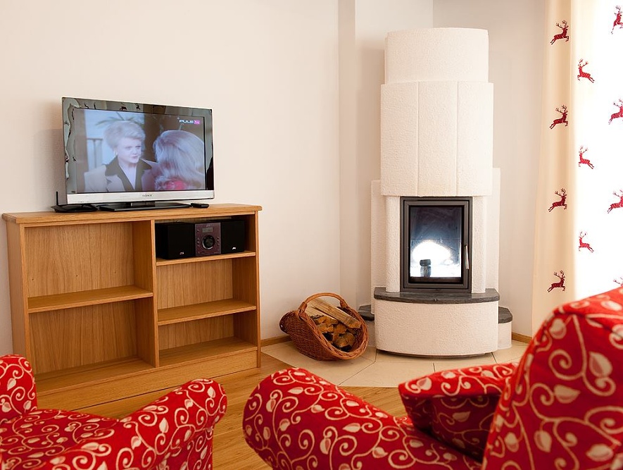 - Chata Ankogel – asi 130 m2, obývacia miestnosť s krbom / pieckou a gaučom