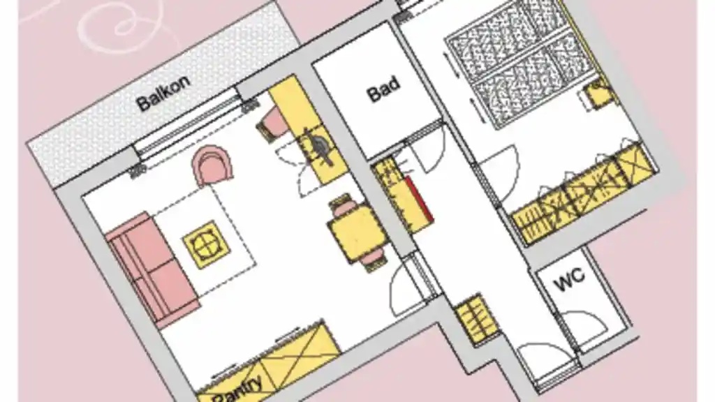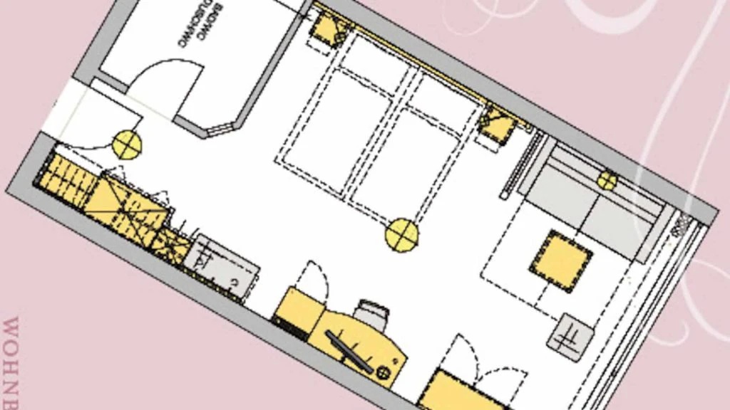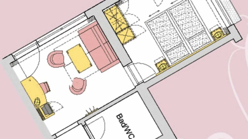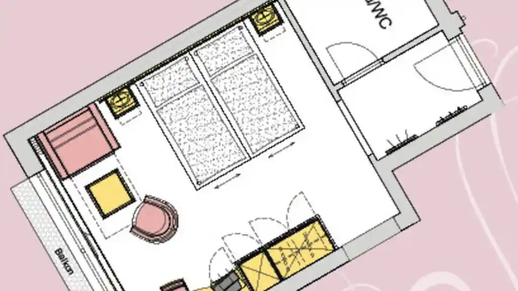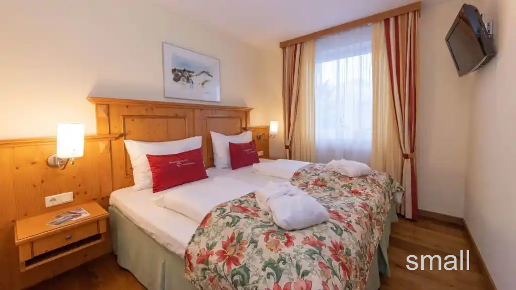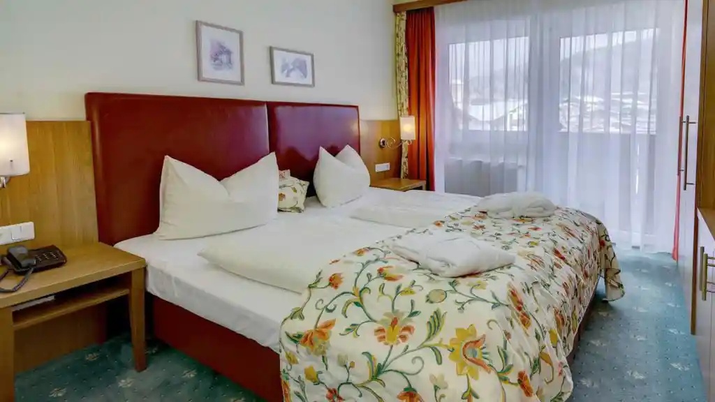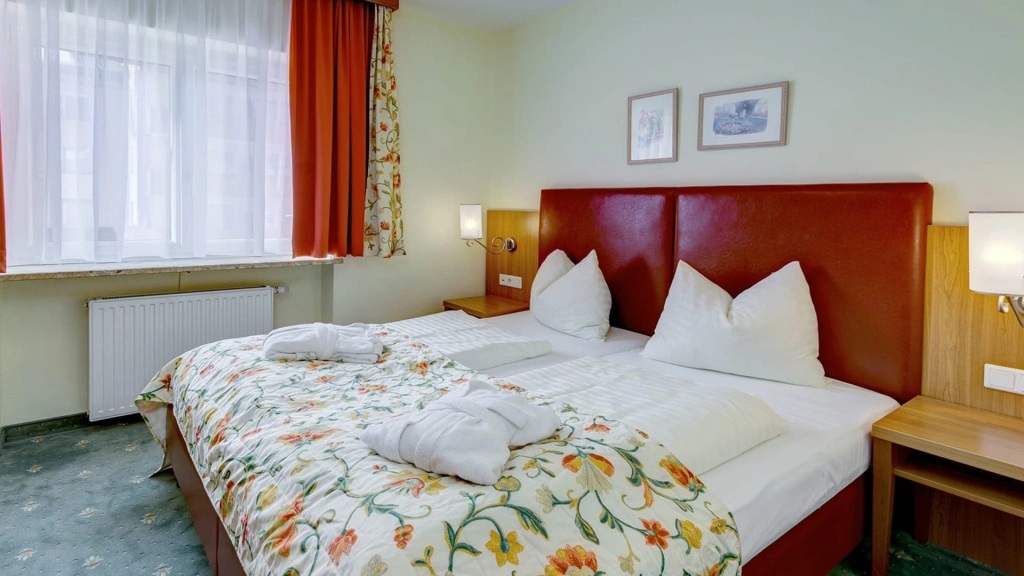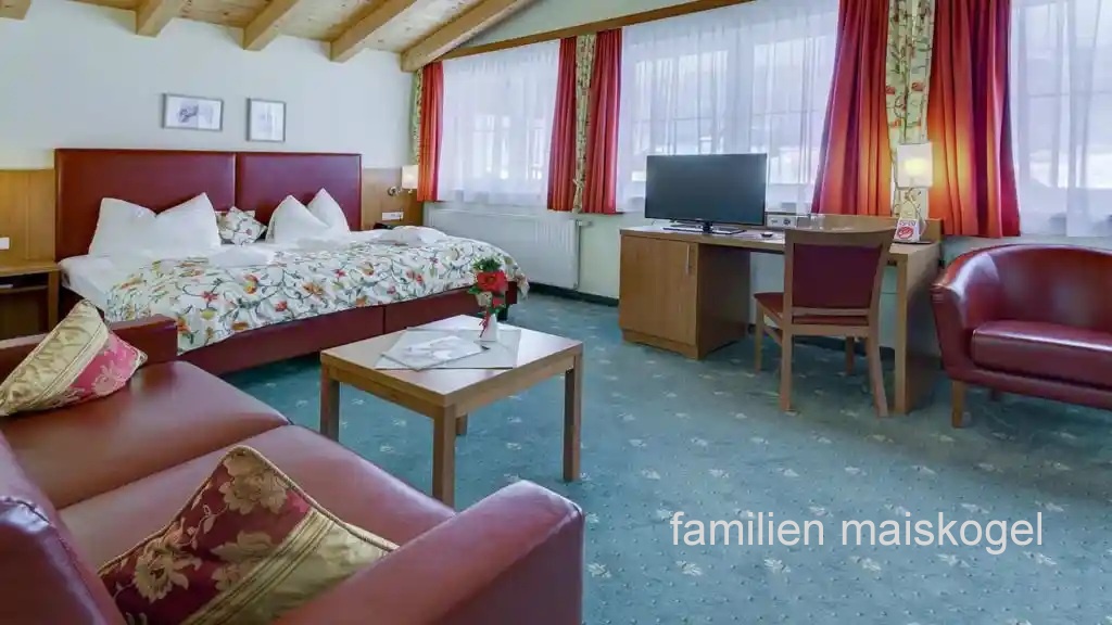 - Rodinná izba Maiskogel – asi 27m2, pre 2-3 osoby, obývacia časť s gaučom, v prednom krídle hotela bez výťahu, balkón.