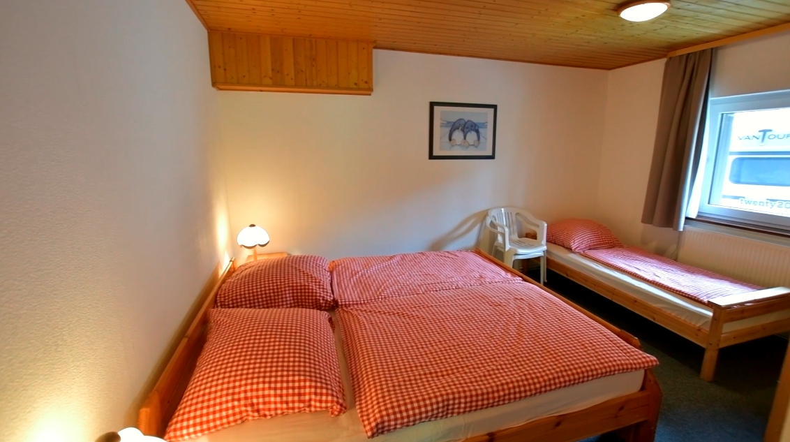 - Apartmán pre 5 osôb – má spálńu s 3 lôžkami, spálňu s manželskou posteľou, obývaciu miestnosť s jedálenským stolom, posedenie, kuchynský kútik, kúpeľňu so sprchou a WC.