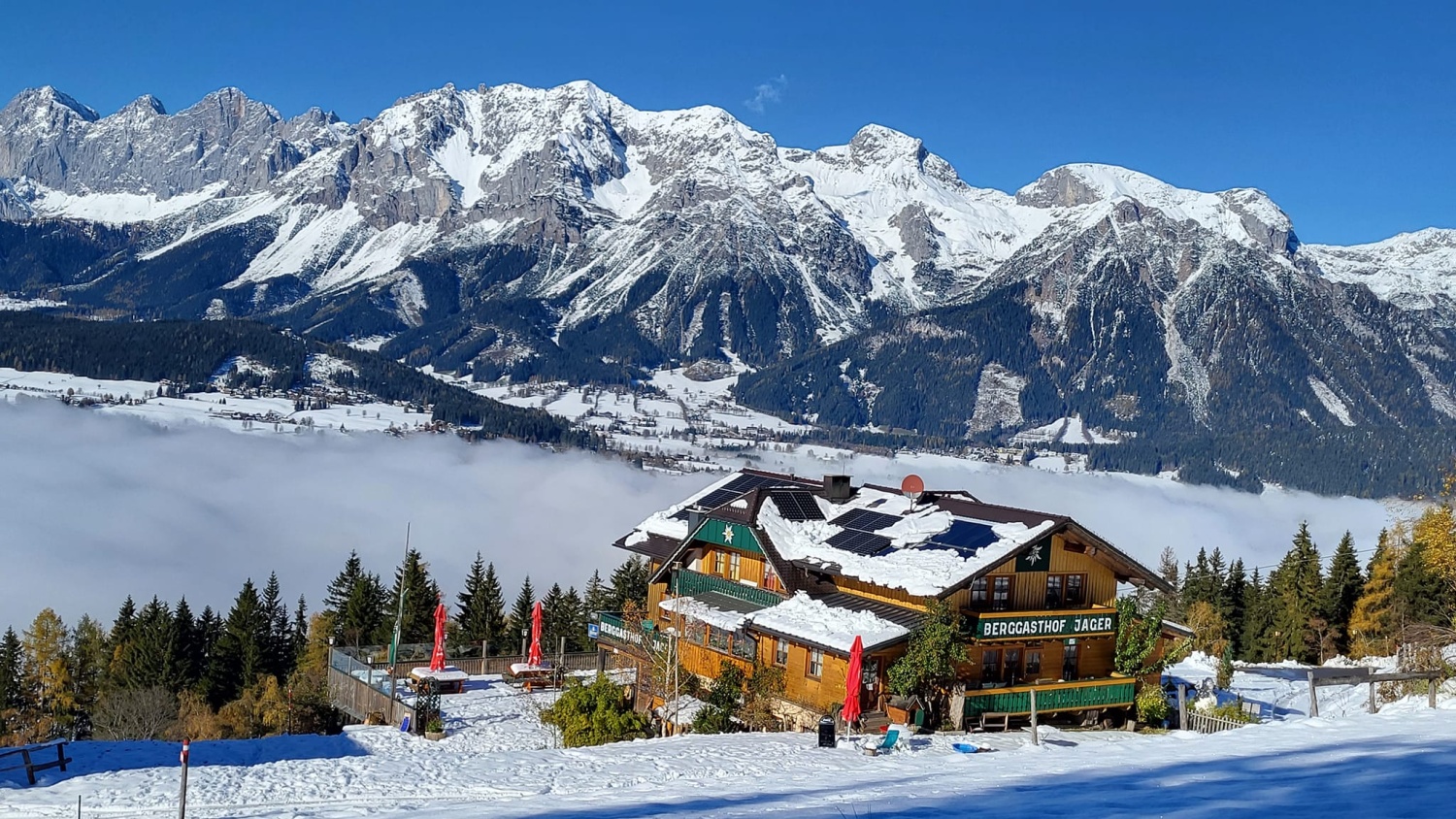 Berggasthof Jager, Schladming má stube s barom, pôvodnú farmerstube (salónik), jedáleň, zimná záhrada, slnečná terasa a parkovisko.