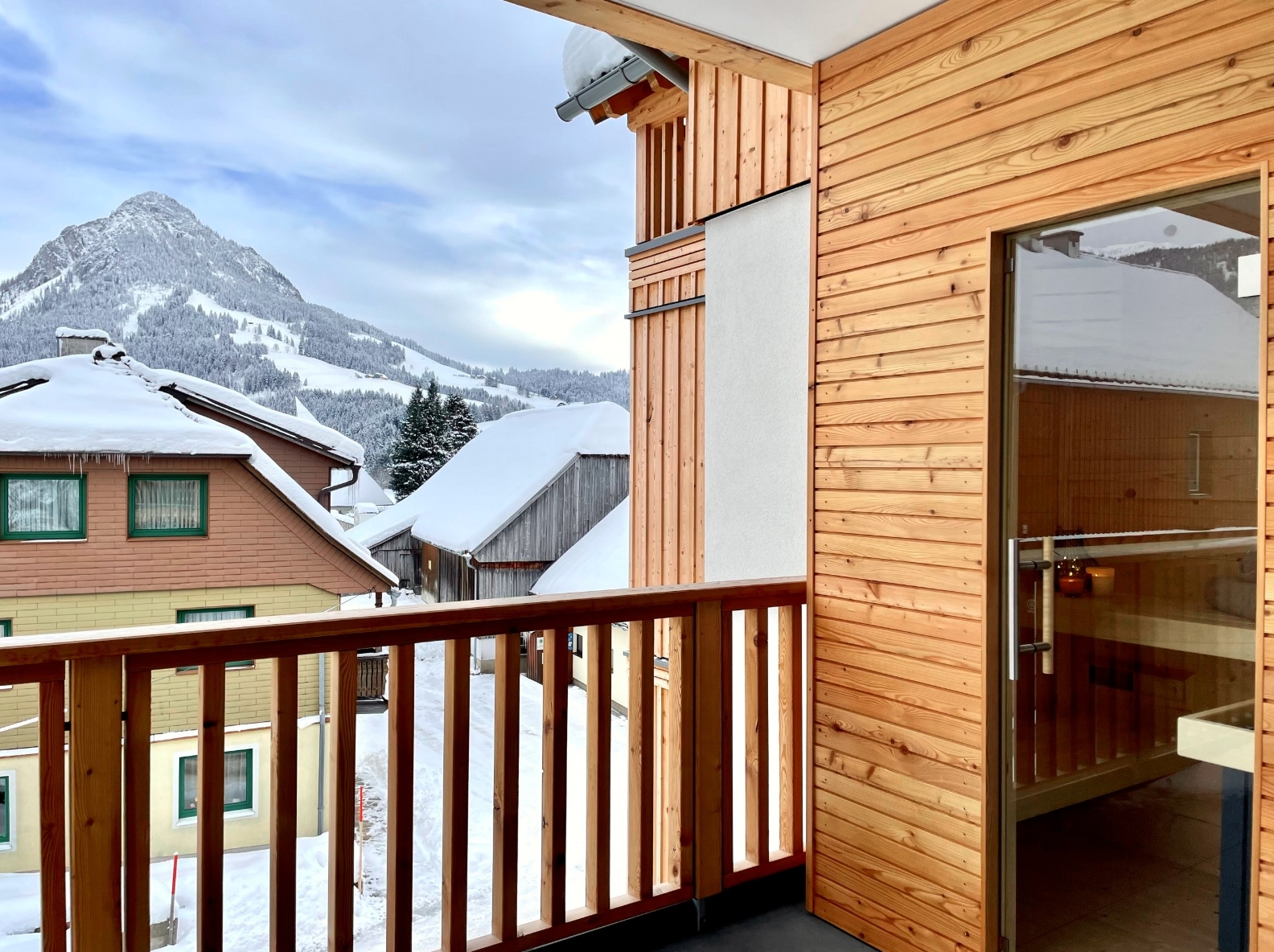 kompletne vybaveným kuchynským kútikom a krbom, kúpeľňu so sprchou a WC, súkromnú saunu, 2 x SAT TV, balkón.