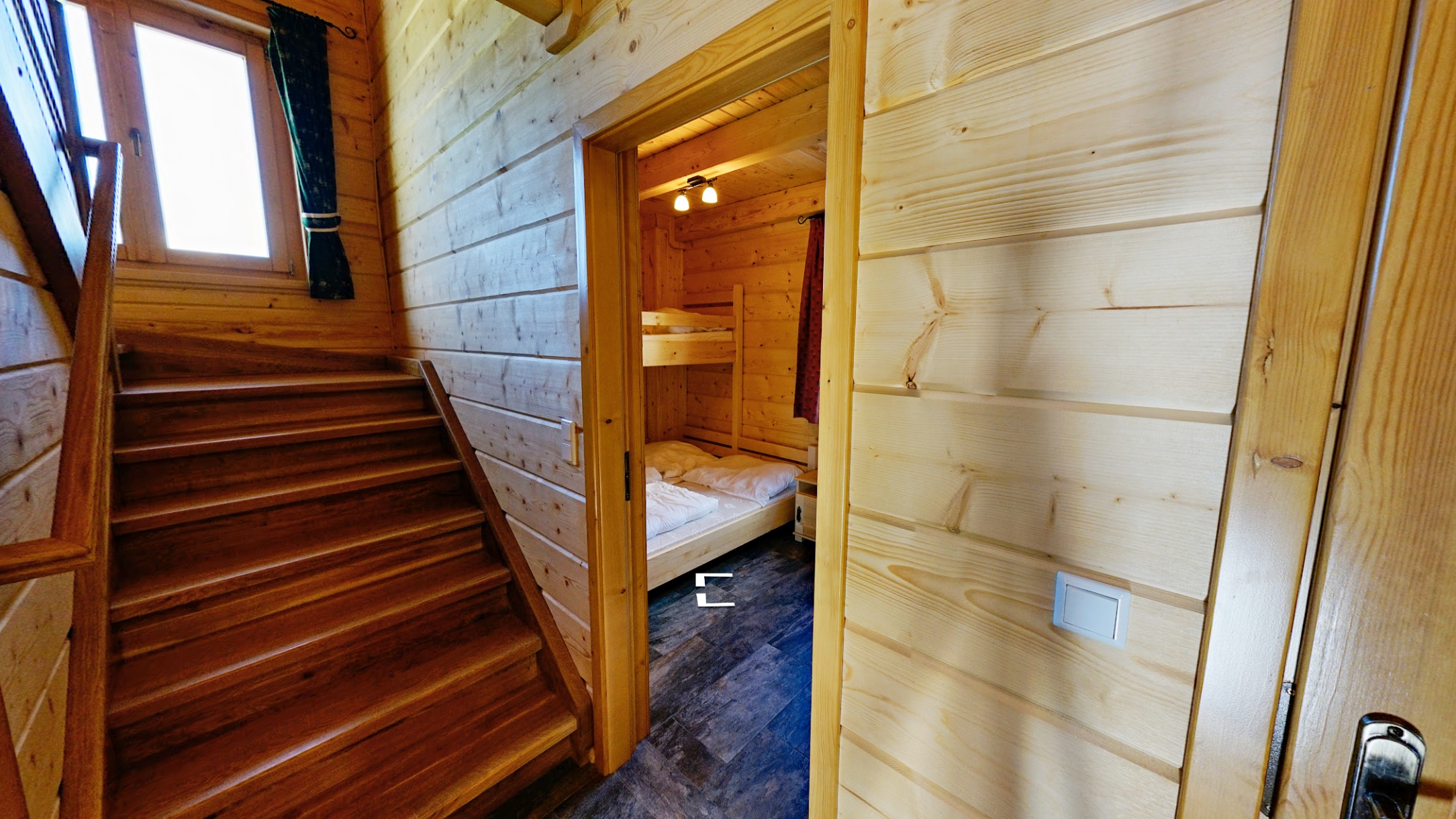 - Poschodie – dostupné po drevenom schodisku, 2 spálne s manželskou posteľou, 1 viaclôžková
