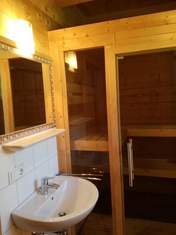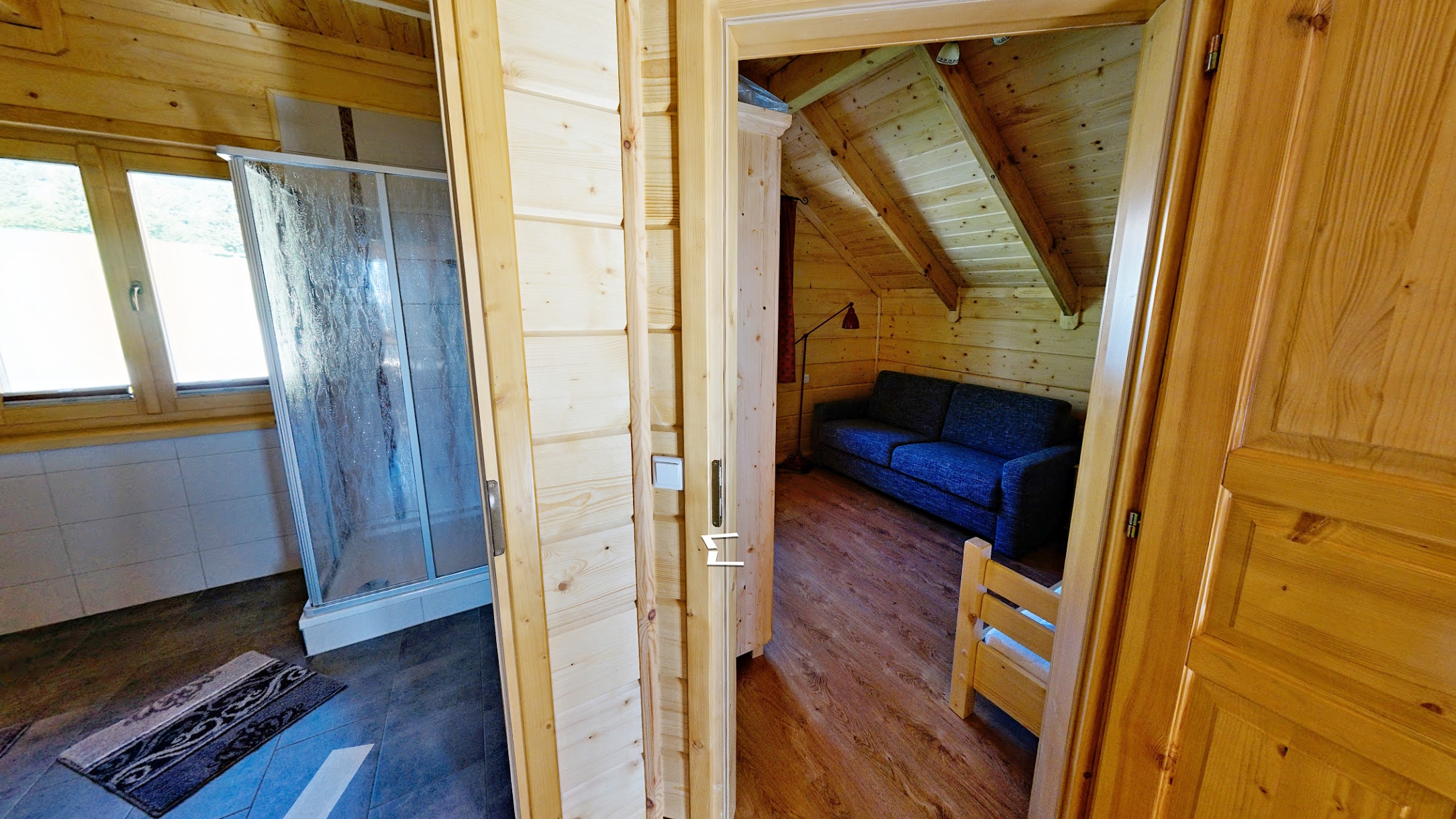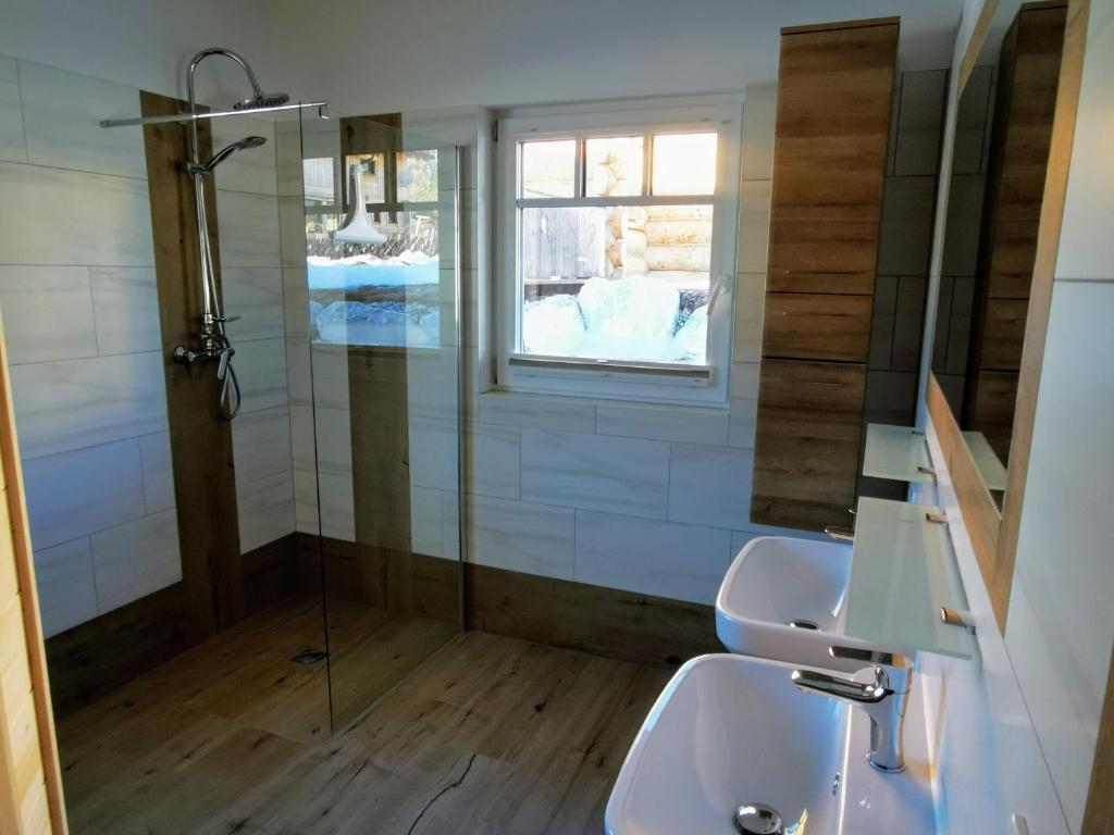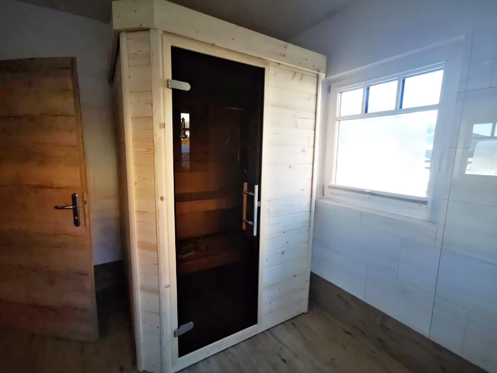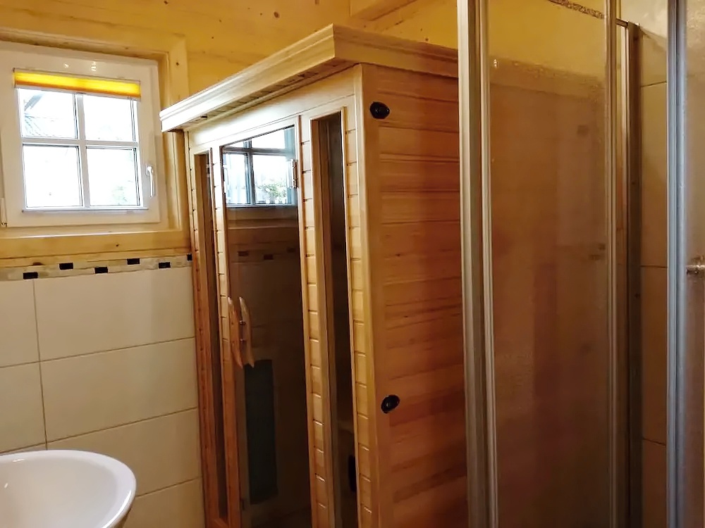Kúpeľňa so sprchou, umývadlom a saunou pre 4-5 osôb a vstupom von, kde sa môžete v zime ochladiť v snehu. Samostatné