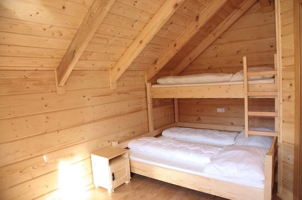 spálňa, kde je poschodová posteľ - dolu je miesto pre 2 osoby a hore pre 1 osobu, k tomu rozkladací gauč pre 1-2 osoby. Kúpeľňa