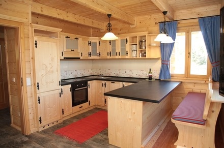 kuchyňa, 2 kúpeľne, 2 toalety, malá sauna. Samostatná dvojpodlažná chata č. 331 postavená z čistého, olejovaného smrekového