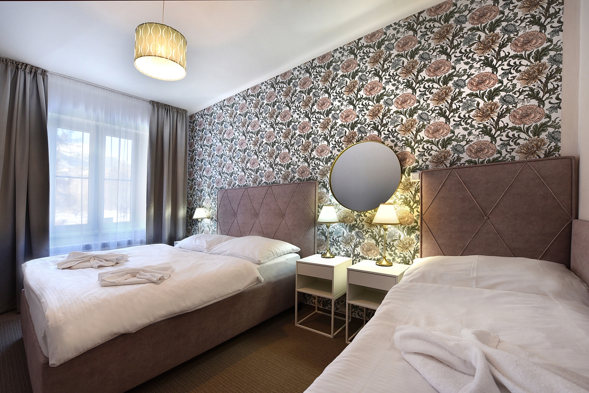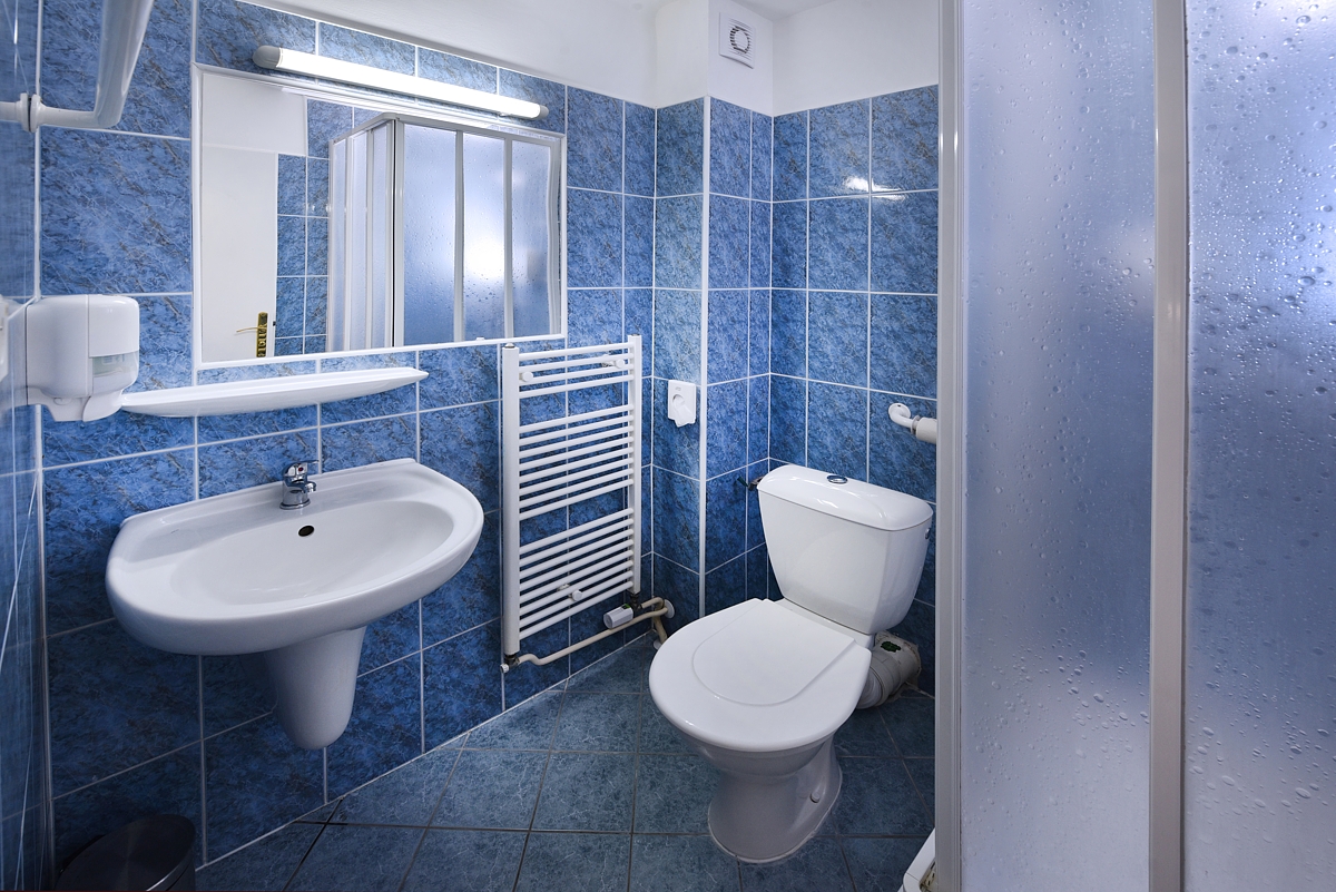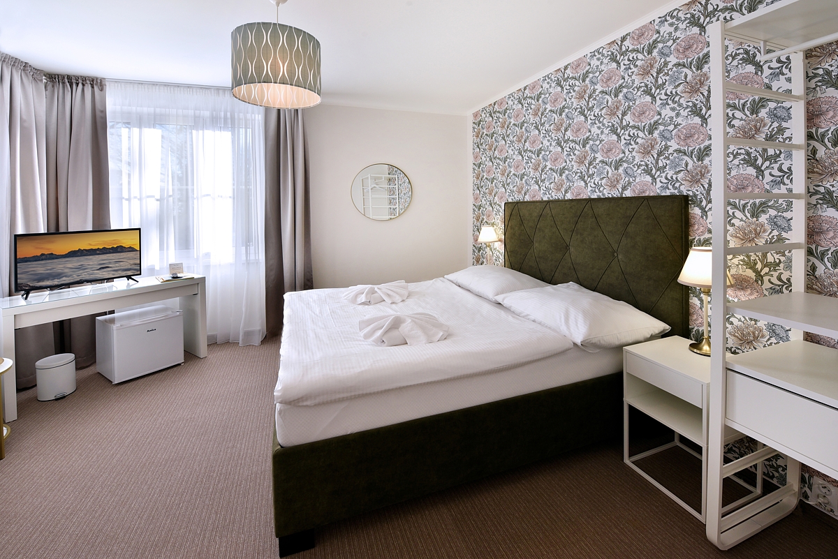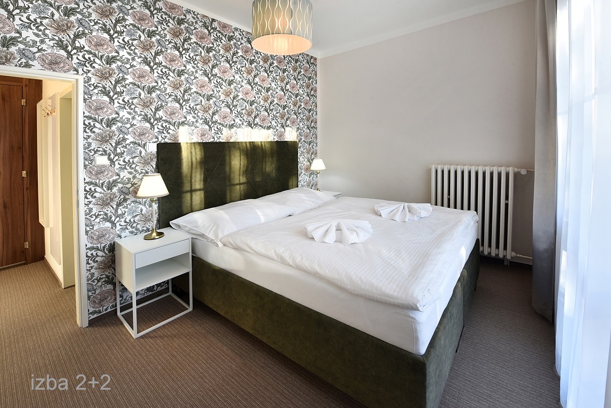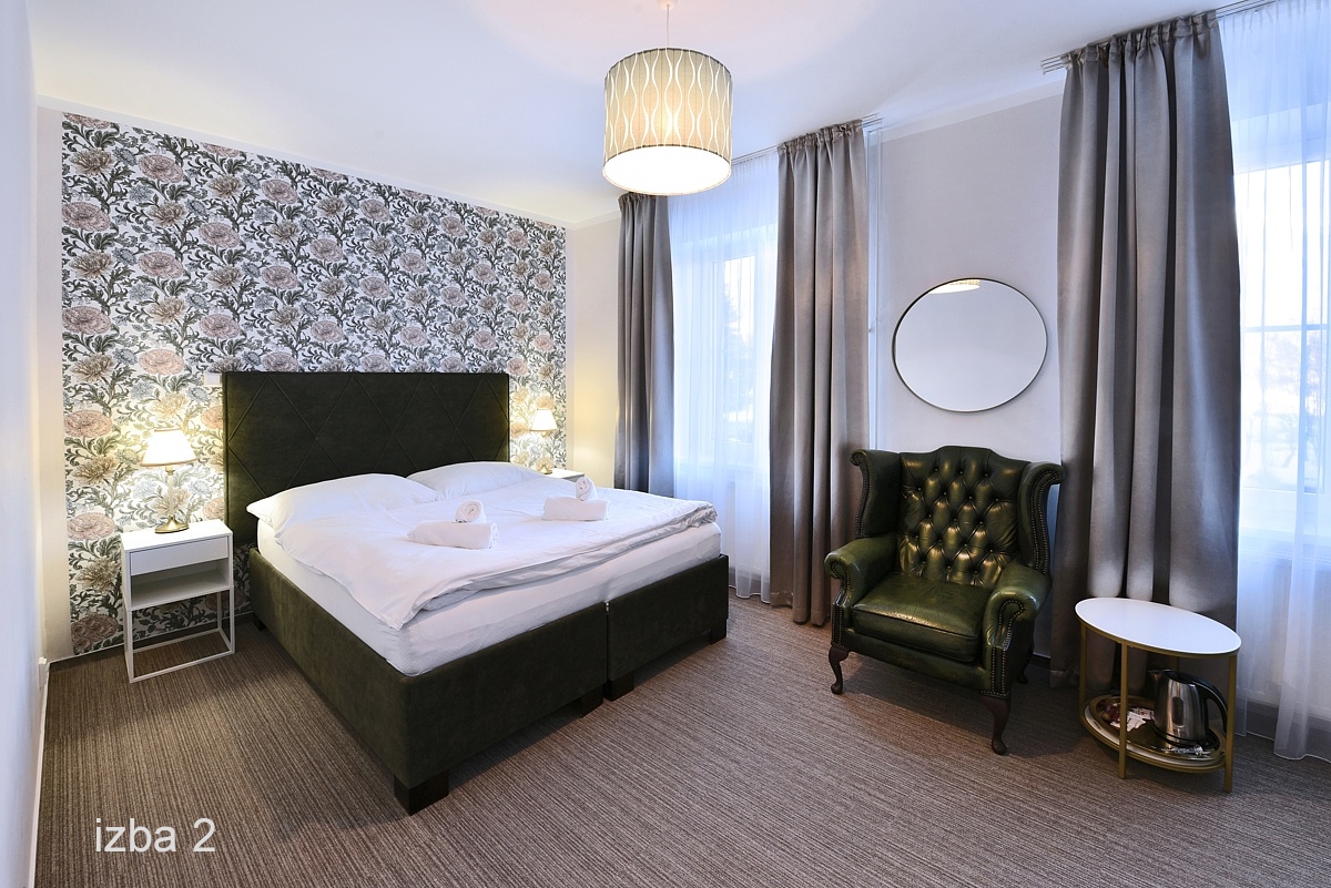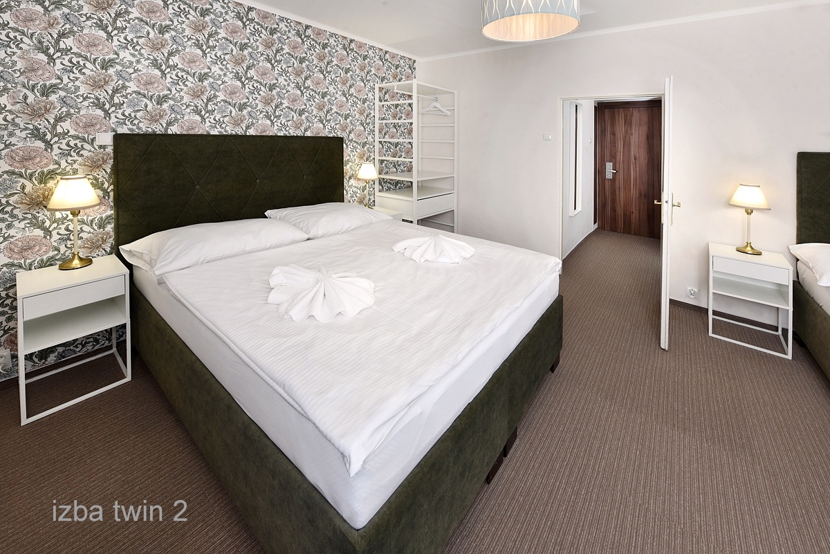 - Dvojlôžková izba – asi 13 m2 – pre max. 2 osoby – dve samostatné oddelené lôžka s nočnými stolíkmi a lampičkami, odkladací priestor poličky, písací stolík, SAT TV LCD, 2 poháre na víno, 2 šálky na čaj.