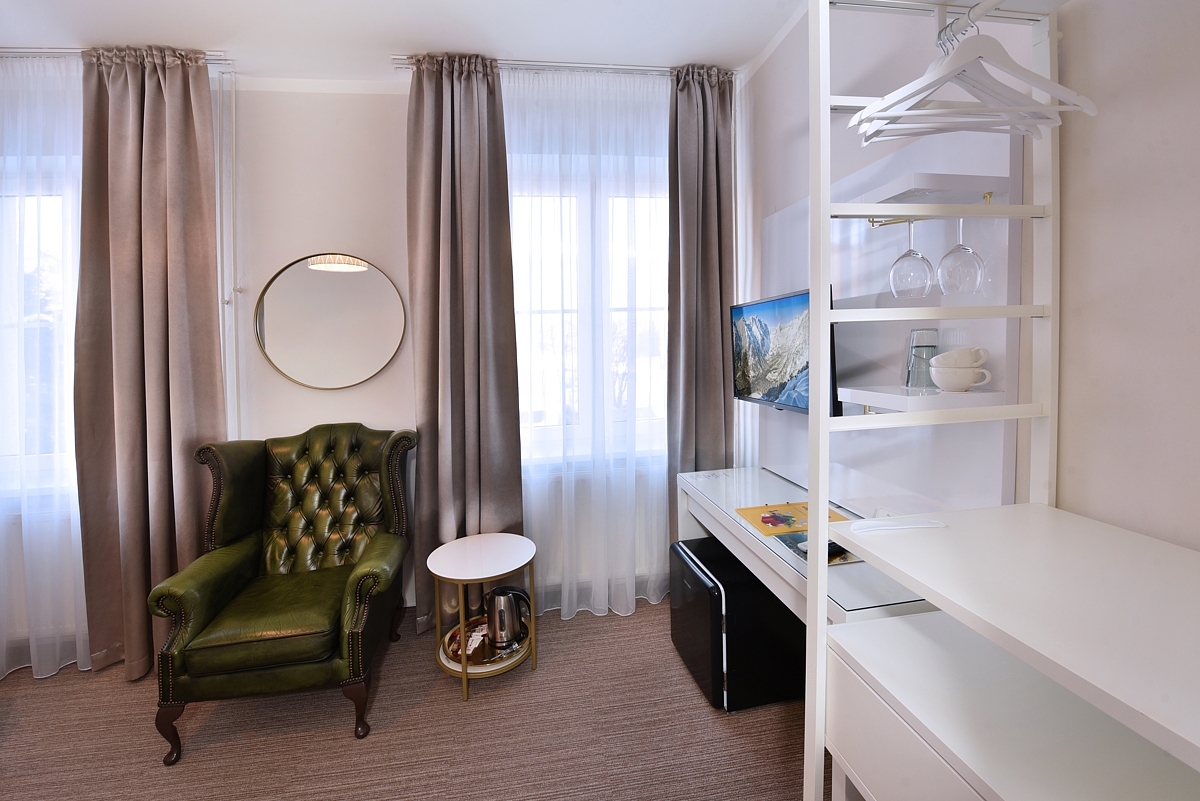 Trojpodlažný hotel má priestranné pohodlné dvojlôžkové a trojlôžkové izby a apartmány rôznych veľkostí. Všetky majú kúpeľňu so sprchovacím kútom a WC, SAT TV LCD, Wi-Fi, trezor, písací stolík, kreslo alebo taburetku, odkladací poličkový regál na oblečenie alebo skriňu s úložným priestorom. Niektoré apartmány majú rýchlo varnú kanvicu, mini chladničku, poháre na víno, šálky na čaj, balkón / terasku s posedením, stolík a kresielka.