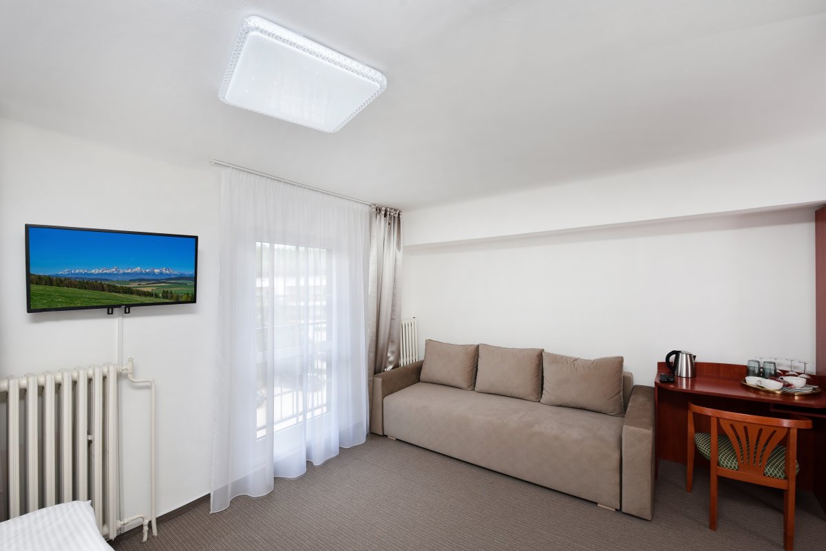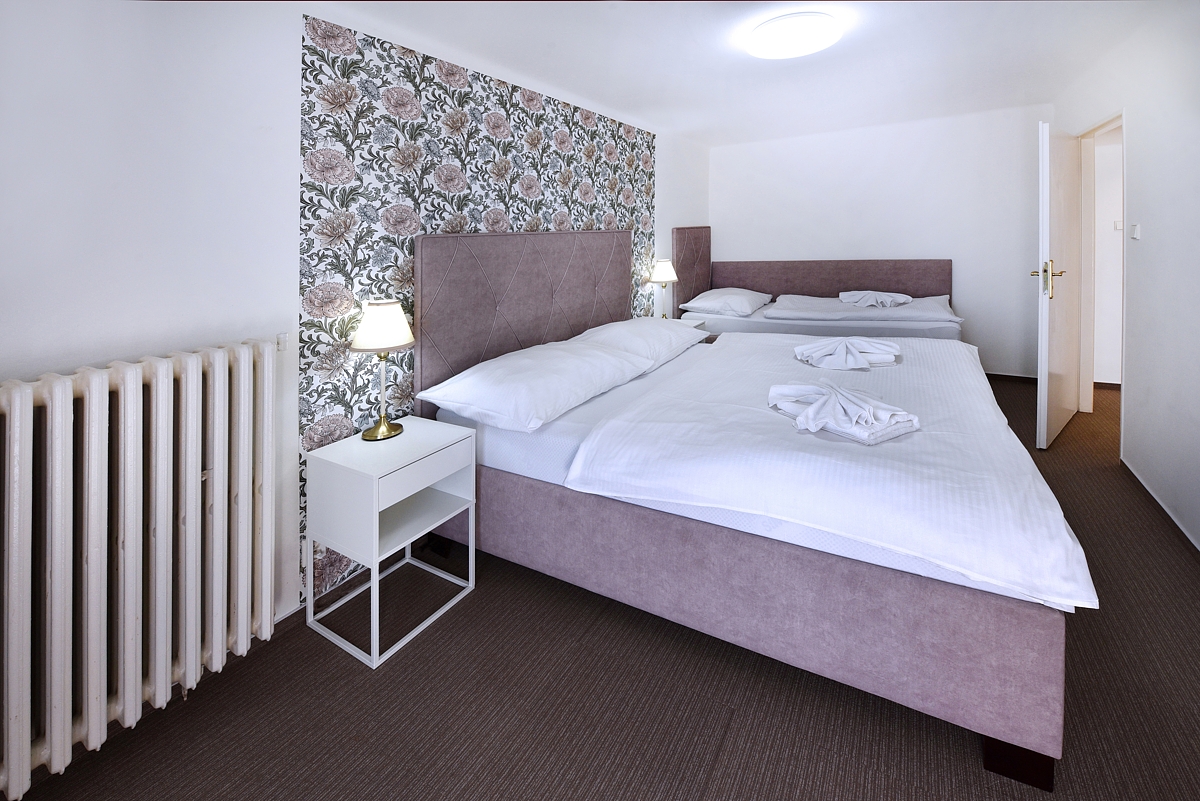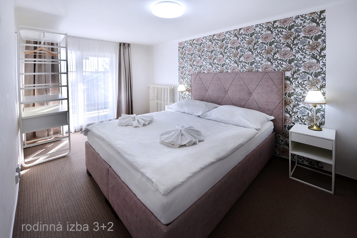 - Trojlôžková izba – asi 20 m2 – pre max. 2-3 osoby - manželská posteľ + 1 samostatné lôžko. Písací stolík, SAT TV LCD.
