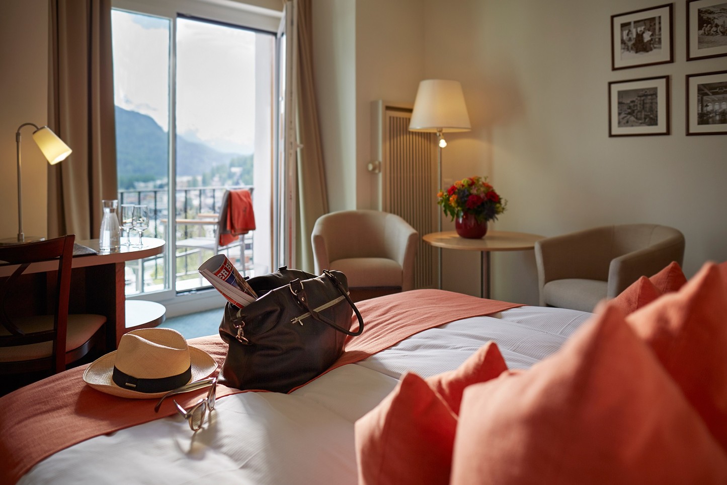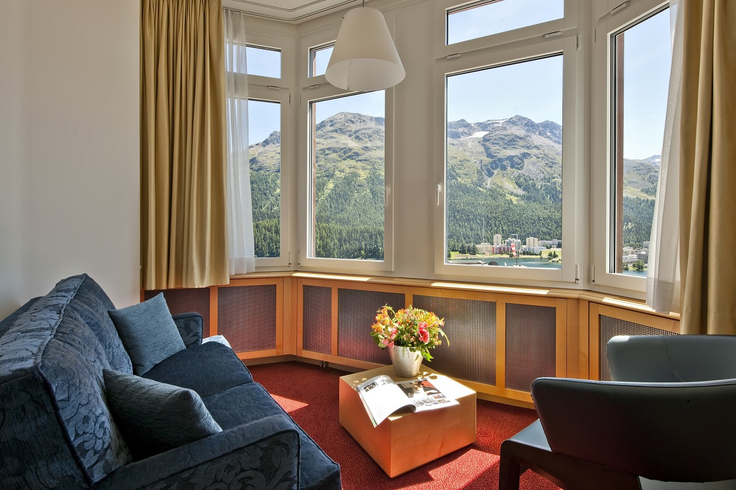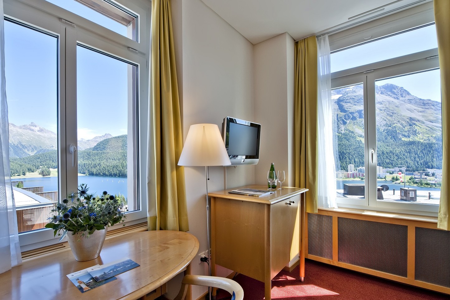 - Junior Suite Corvatsch – vrchol komfortu hotela Schweizerhof, s oddeleným sedením, balkónom a krásnym výhľadom na jazero.