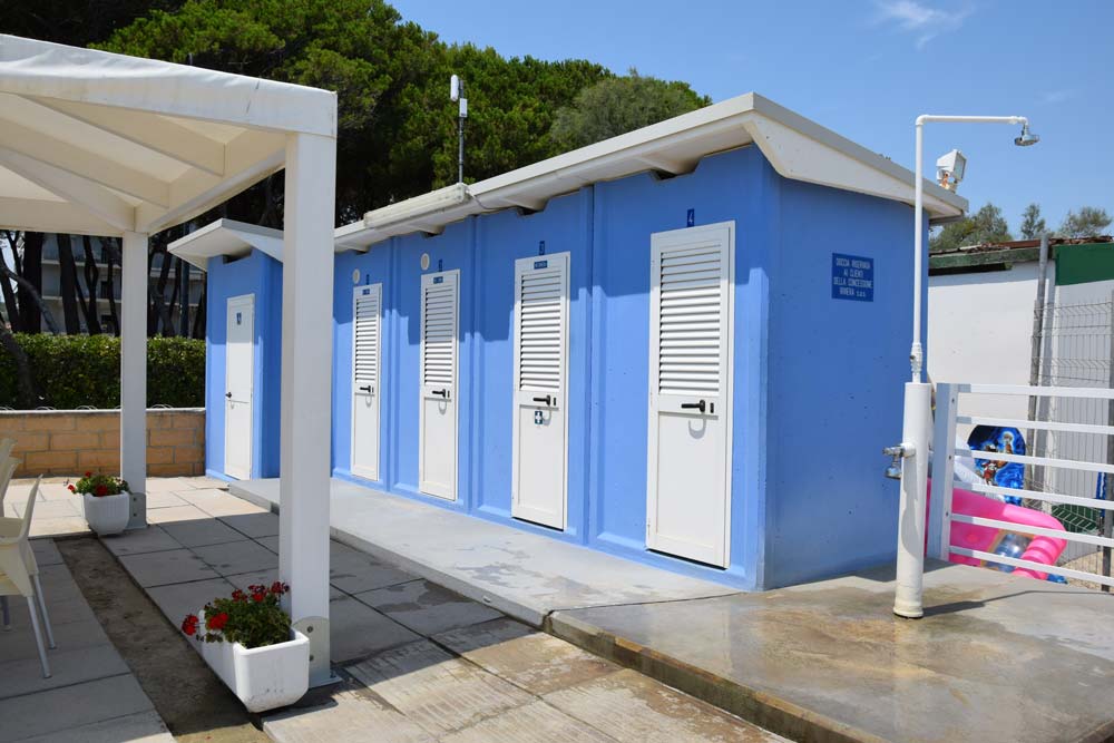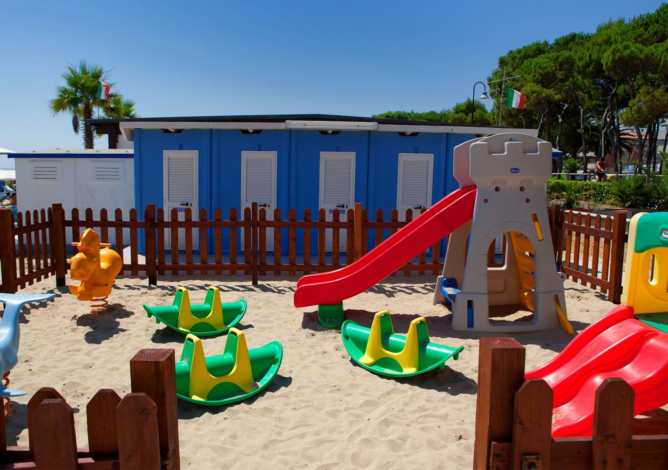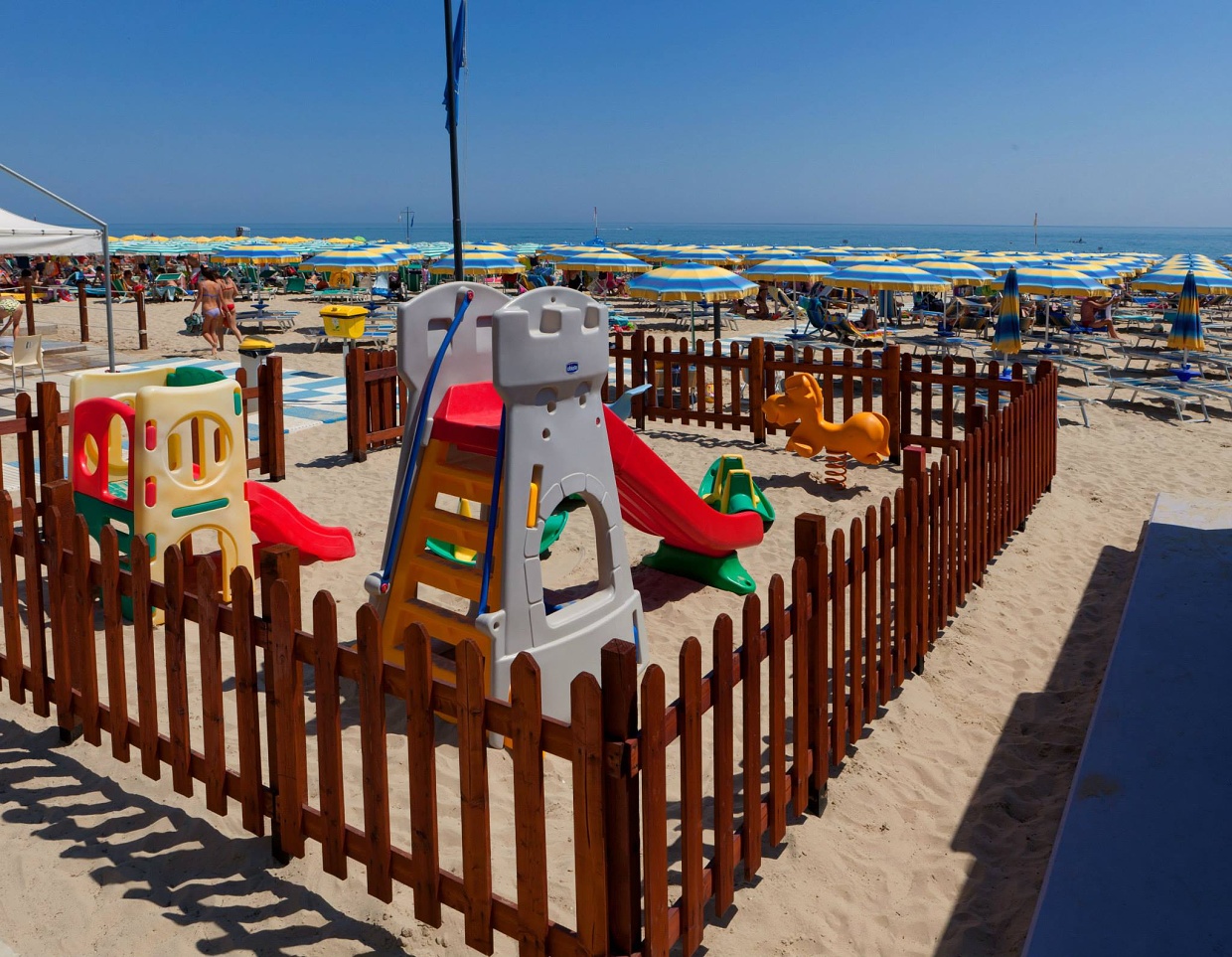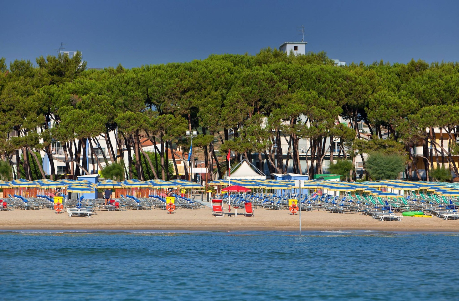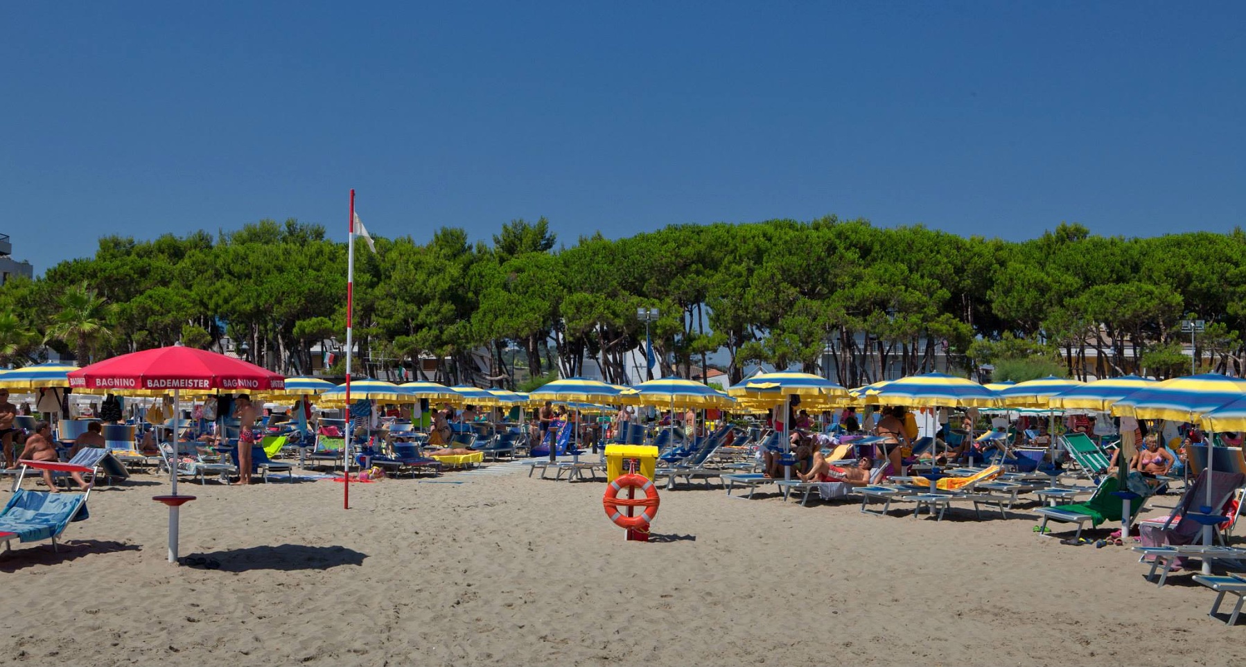 Piesočnatá pláž s pozvoľným vstupom do mora je vzdialená asi 80 m - cez cestu a malý lesík s ihriskom. Plážový servis - 1 slnečník a 2 ležadlá resp kreslá / izba v cene. Na pláži k dispozícii toalety, sprchy, prezliekacie kabínky, detské ihrisko.