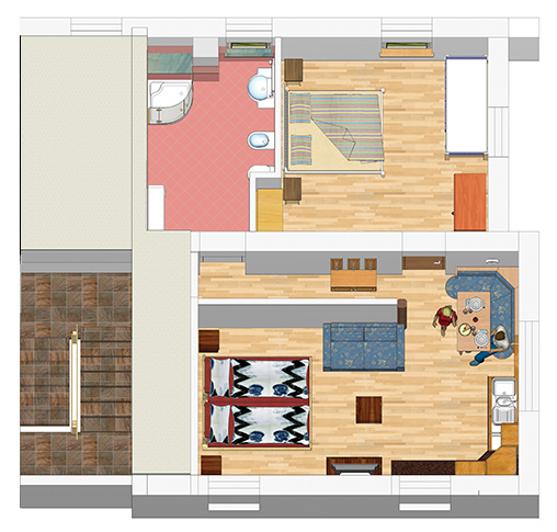 - Apartmán 2 - typ C – má spálňu s manželskou posteľou, spálňu s 3 lôžkami, obývaciu