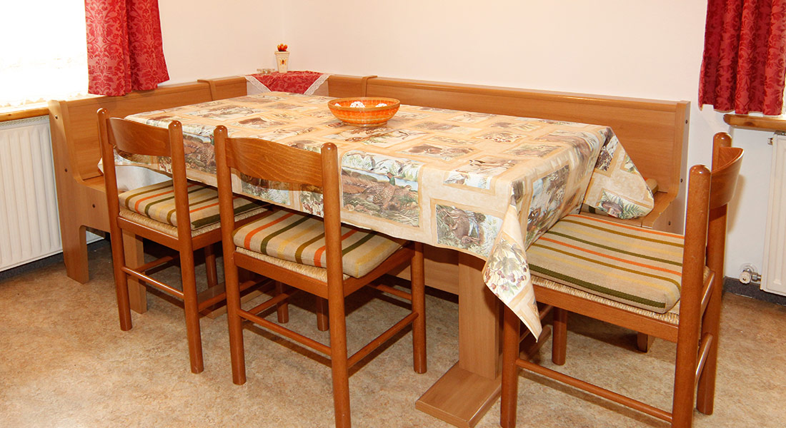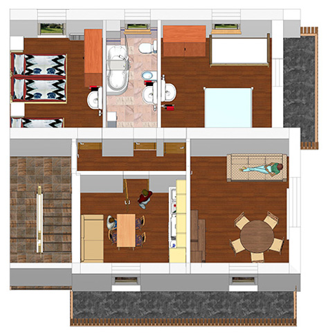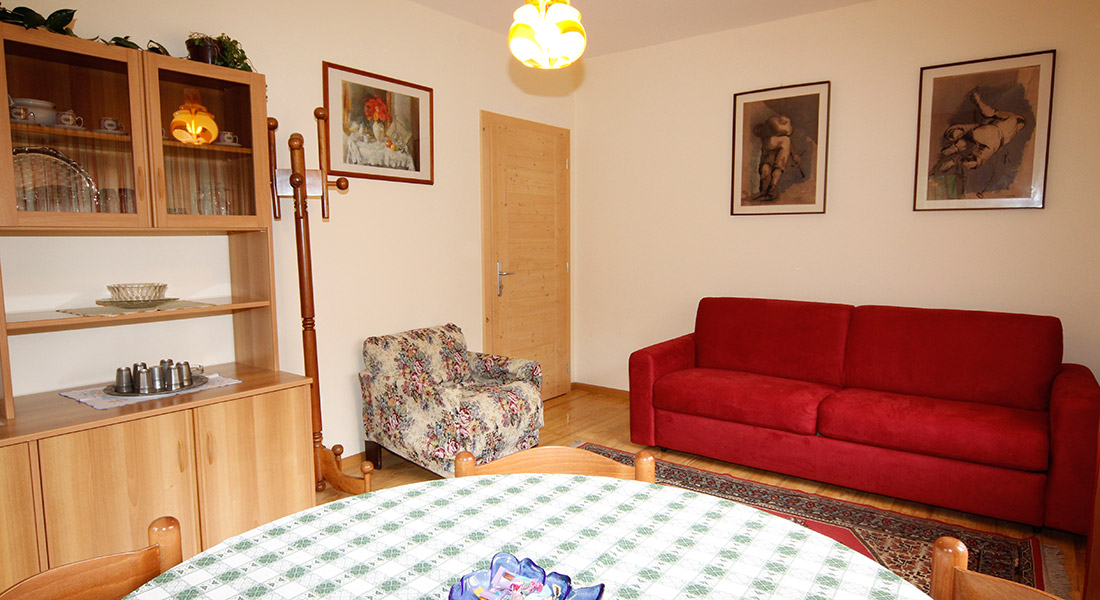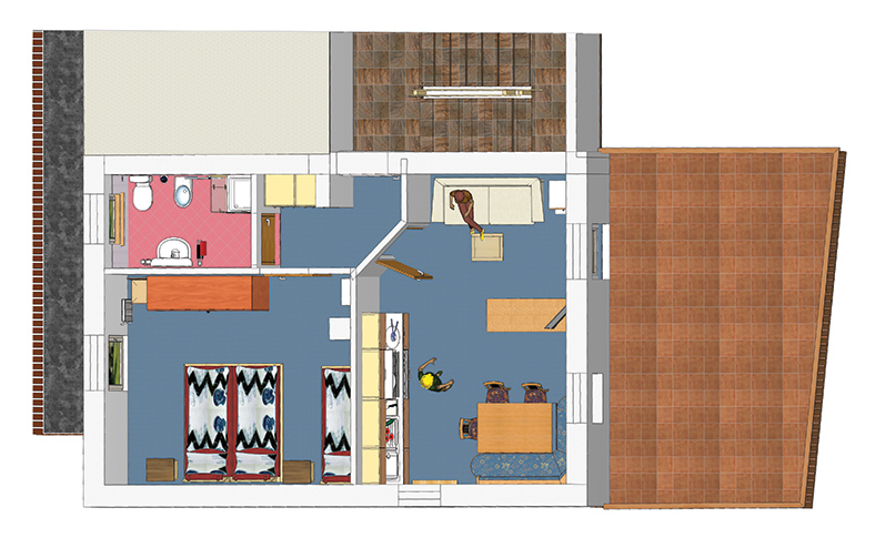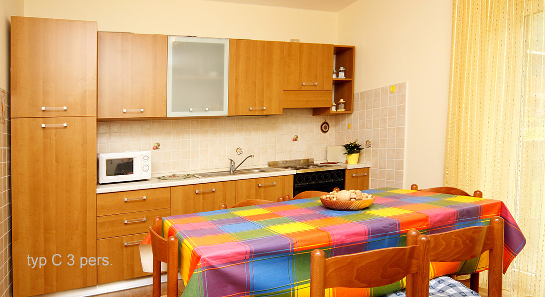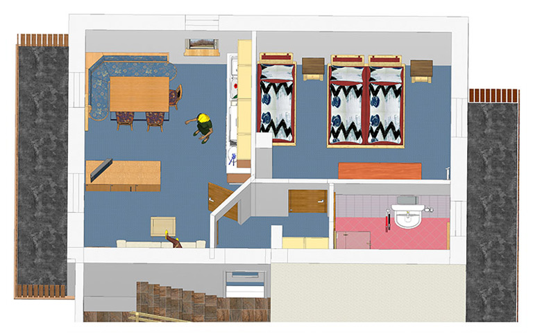 - Apartmán 1 - typ B – nachádza sa na prízemí, má spálňu s 3 lôžkami a obývaciu miestnosť s 2 lôžkami a gaučom,