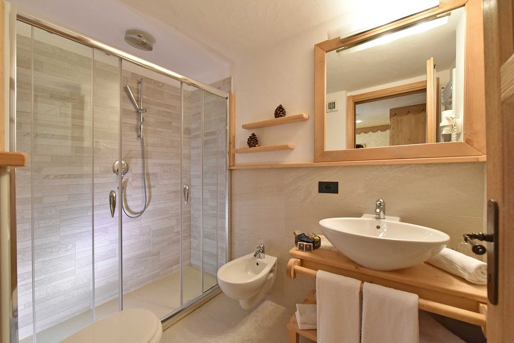 Príjemne zariadené izby v alpskom štýle s množstvom dreva majú kúpeľňu so sprchou a WC, sušič na vlasy,