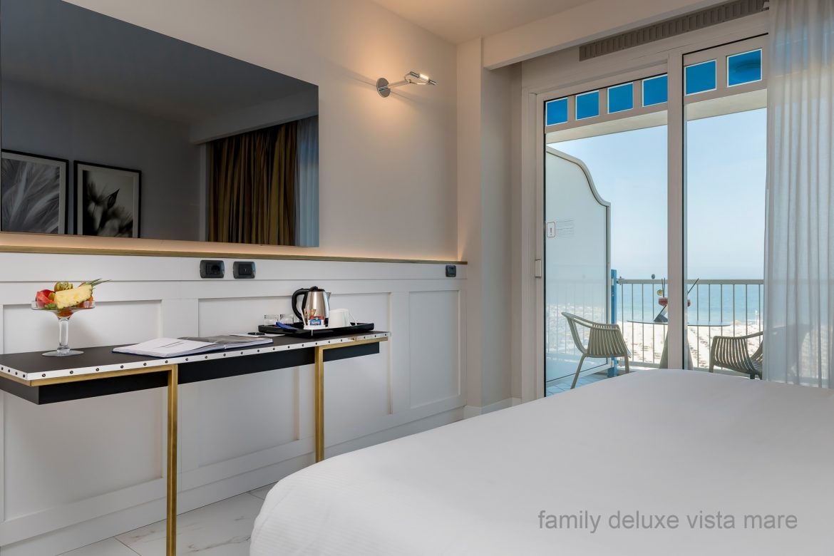 - Typ Family Deluxe – asi 45 m2pre 4 osoby - 2 x manželská posteľ typ „queen“ (160 x 200 cm), izba má 33 m2 a balkón 12 m2, morská strana.