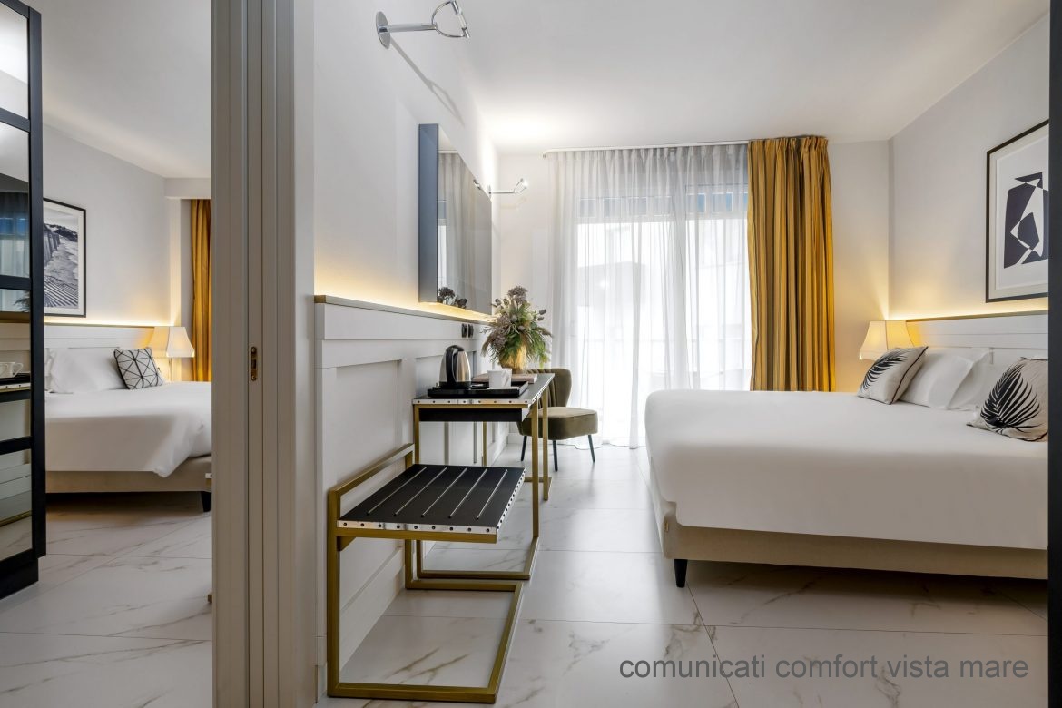 - Rodinná izba – 2 prepojené izby posuvnými dverami, každá o rozlohe 20 m2, každá s vlastnou kúpeľňou a balkónom, morská strana alebo mesto.