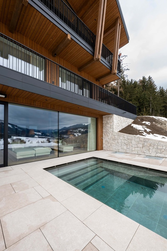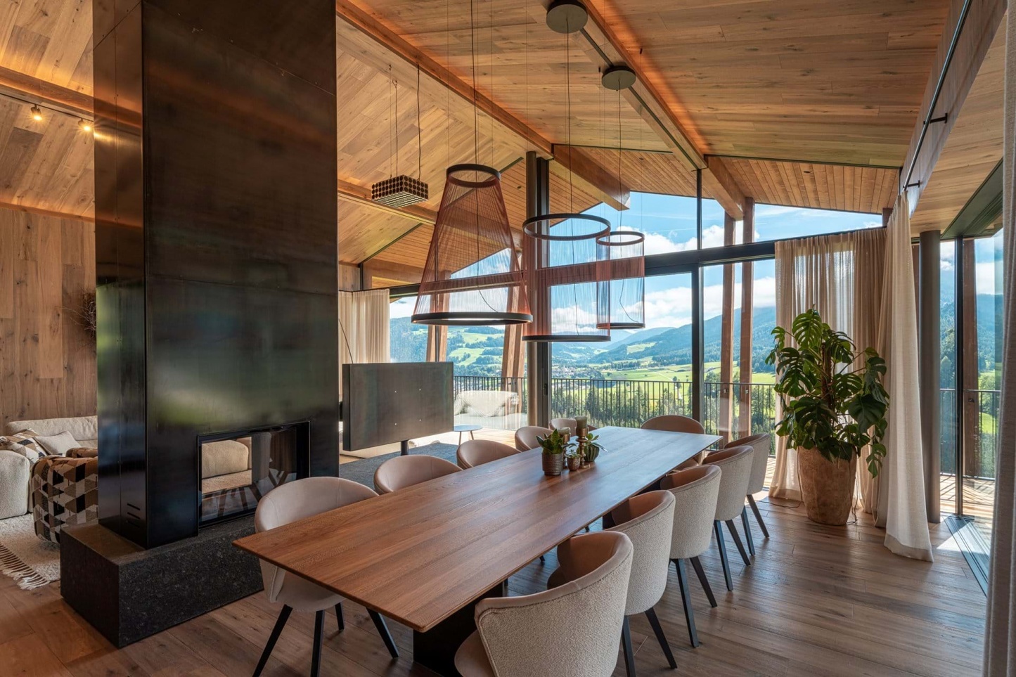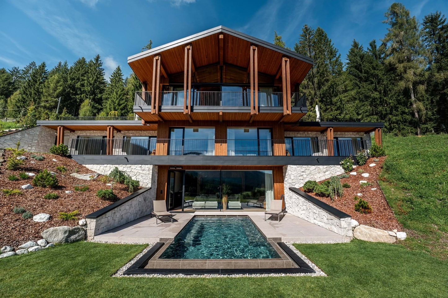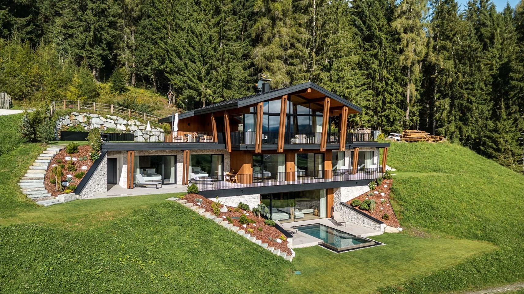 ***** / Luxusný chalet pre 12 osôb, so 6 spálňami, wellness zónou s vyhrievaným bazénom aj domácim kinom, asi 900m od zjazdovky strediska Kronplatz.
