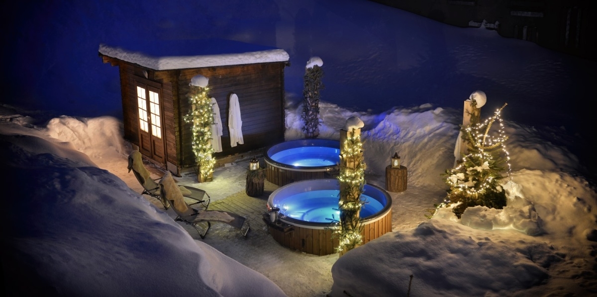 Fínska sauna, turecký kúrpeľ, 2 vonkajšie vírivky, senzorický chodník, relaxačná zóna, využívanie zdarma, rezervovať treba na mieste.