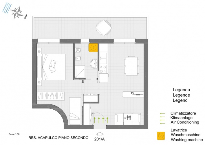 Jednoducho a účelne zariadené apartmány majú kúpeľňu so sprchou a WC, pračku, kuchynský kútik, chladničkou a mraziacim boxom, TV a balkón. Pridelené parkovacie miesto / na 1 apartmán v cene. Wi-Fi a klimatizácia dostupná, na vyžiadanie vopred (za poplatok na mieste).